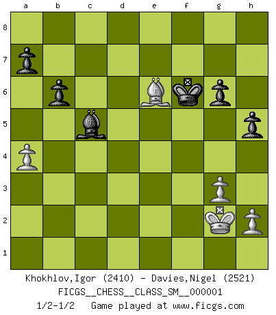 Last move : 1/2-1/2 2006 October 15 18:45:14 [Event "FICGS__CHESS__CLASS_SM__000001"] [Site "FICGS"] [Date "2006.05.30"] [Round "1"] [White "Khokhlov,Igor"] [Black "Davies,Nigel"] [Result "1/2-1/2"] [WhiteElo "2410"] [BlackElo "2521"] 1.e4 e5 2.Nf3 Nc6 3.Bc4 Nf6 4.d4 exd4 5.e5 Ne4 6.Qe2 Nc5 7.O-O Ne6 8.Re1 d5 9.exd6 Bxd6 10.Nbd2 O-O 11.Ne4 Nf4 12.Qd1 Bf5 13.c3 dxc3 14.bxc3 Bxe4 15.Rxe4 Qf6 16.g3 Ne6 17.Be3 Rad8 18.Qe2 Nc5 19.Rg4 Rde8 20.Rc1 Re4 21.Rxe4 Nxe4 22.Bd4 Nxd4 23.cxd4 Ng5 24.Nxg5 Qxg5 25.Rb1 b6 26.Qf3 g6 27.Kg2 c5 28.Rd1 Qe7 29.Qc6 Rd8 30.dxc5 Bxc5 31.Rxd8+ Qxd8 32.Qb7 Qf6 33.Qf3 Qe7 34.Qe2 Qc7 35.Qe4 Kg7 36.f4 Bd6 37.Qd5 Qe7 38.a4 h5 39.Qd4+ Kg8 40.Qd5 Bc5 41.Qe5 Qd8 42.Qd5 Qe8 43.f5 Kg7 44.fxg6 fxg6 45.Qe6 Qxe6 46.Bxe6 Kf6 1/2-1/2 Two knights defense Kingside Castling by player White (move 7) Kingside Castling by player Black (move 10) This chess game ended in a draw. Follow this game move after move (download)Chess is in its essence a game, in its form an art, and in its execution a science. (Baron Tassilo) Schach wird sich dank seiner hohen kulturellen Tradition immer durchsetzen. In näherer Zukunft womöglich sogar als Gegenreaktion auf die maßlose Reizüberflutung im Freizeit- und Spielbereich. (Garry Kasparov) Tu puedes aprender mucho mas de una partida que pierdas que de una partida ganada. Tendras que perder cientos de partidas antes de llegar a ser un buen jugador. (Jose Raul Capablanca) Les échecs sont plus proches de l'art de l'assassinat que de l'art de la guerre. (Arturo Perez-Reverte) Knowledge will give you power, but character respect. (Bruce Lee)