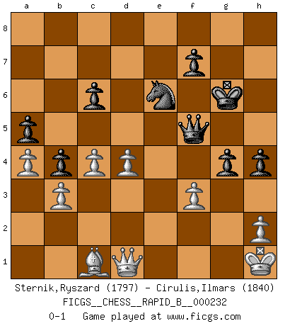 Last move : 0-1 2015 August 31 22:43:41 [Event "FICGS__CHESS__RAPID_B__000232"] [Site "FICGS"] [Date "2015.07.31"] [Round "1"] [White "Sternik,Ryszard"] [Black "Cirulis,Ilmars"] [Result "0-1"] [WhiteElo "1797"] [BlackElo "1840"] 1.e4 c6 2.d4 d5 3.Nc3 dxe4 4.Nxe4 Nf6 5.Nxf6+ exf6 6.Bc4 Na6 7.Nf3 Bd6 8.O-O O-O 9.Re1 Re8 10.Rxe8+ Qxe8 11.Bd2 Bf5 12.Nh4 Be6 13.Qe2 g5 14.Nf3 Nc7 15.Re1 Bf5 16.Qf1 Qd7 17.Bd3 b5 18.b3 a5 19.a4 b4 20.Bc1 Nd5 21.Nd2 Bf4 22.g3 Bxd2 23.Bxd2 Kg7 24.f3 Bxd3 25.Qxd3 Rd8 26.Re4 Nc7 27.Be3 h5 28.Kg2 Qf5 29.Qe2 Ne6 30.Kg1 Qd5 31.Kf2 Nf8 32.Qd3 Ng6 33.Bc1 h4 34.g4 f5 35.gxf5 Qxf5 36.c4 Rd6 37.Re3 Qh3 38.Kg1 Nf4 39.Qf1 Qd7 40.Bb2 Kh6 41.Re4 Kg6 42.Kh1 Qf5 43.Bc1 Re6 44.Rxe6+ Nxe6 45.Qd1 g4 0-1 Caro-Kann : Forgacs variation Kingside Castling by player White (move 8) Kingside Castling by player Black (move 8) Player Black won this chess game. Follow this game move after move (download)A strong memory, concentration, imagination, and a strong will is required to become a great Chess player. (Bobby Fischer) Frage: Was machen Sie mit den Preisen? Anwort: Ich habe Angst, dass meine Freundin davon neue Kleider kauft. (Loek van Wely) Aunque la mayoría de la gente disfruta observar las partidas de los grandes Maestros de ataque, algunos de los jugadores mas notables en la historia han sido los jugadores silenciosos posicionales. Lentamente ellos te aplastan despojandote de tu espacio, congestionando tus piezas y dejandote virtualmente sin nada que hacer. (Yasser Seirawan) Mais n'est-ce pas déjà le limiter injurieusement que d'appeler les échecs un jeu? N'est-ce pas aussi une science, un art, ou quelque chose qui, comme le cercueil de Mahomet entre ciel et terre, est suspendu entre l'un et l'autre, et qui réunit un nombre incroyable de contraires ? (Stefan Zweig) The bottom line is always the bottom line. (Johann Piek)