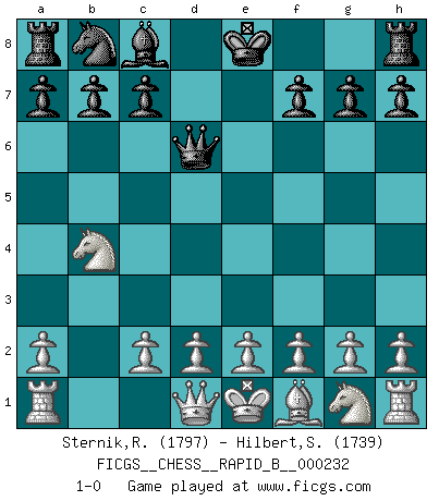 Last move : 1-0 2015 September 29 23:47:13 [Event "FICGS__CHESS__RAPID_B__000232"] [Site "FICGS"] [Date "2015.07.31"] [Round "1"] [White "Sternik,Ryszard"] [Black "Hilbert,Stephan J."] [Result "1-0"] [WhiteElo "1797"] [BlackElo "1739"] 1.b4 e5 2.Bb2 Bxb4 3.Bxe5 Nf6 4.Nc3 d5 5.Bxf6 Qxf6 6.Nxd5 Qd6 7.Nxb4 1-0 This chess game has been lost on time (started : 2015.07.31 5:30:4) Polish (Sokolsky) opening Player White won this chess game. Follow this game move after move (download)Avoid the crowd. Do your own thinking independently. Be the Chess player, not the Chess piece. (Ralph Charell) Modernes Schach erfordert enorme Anspannung. Es ist für einen normalen Menschen unmöglich das auszuhalten. (Viktor Kortschnoi) No volvere nunca a jugar contigo. Has insultado a mi amigo. - cuando un oponente se maldijo por una mala jugada (Miguel Najdorf) Demandez au pauvre Cg1 ce qu'il en pense. Eduard Gufeld à propos de la variante Saemisch de l'Est-Indienne. I don't believe in psychology. I believe in good moves. (Bobby Fischer)