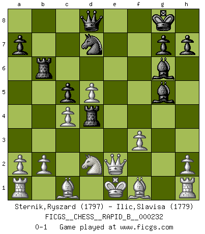 Last move : 0-1 2015 September 7 15:19:56 [Event "FICGS__CHESS__RAPID_B__000232"] [Site "FICGS"] [Date "2015.07.31"] [Round "1"] [White "Sternik,Ryszard"] [Black "Ilic,Slavisa"] [Result "0-1"] [WhiteElo "1797"] [BlackElo "1779"] 1.e4 d5 2.exd5 Nf6 3.d4 Bg4 4.f3 Bf5 5.g4 Bg6 6.c4 e6 7.g5 Nh5 8.Qb3 c5 9.Qxb7 Nd7 10.Ne2 Rb8 11.Qa6 Be7 12.dxe6 fxe6 13.Qxe6 Rb6 14.Qe3 O-O 15.d5 Nf4 16.Nxf4 Bxg5 17.Nd2 Rxf4 18.Qe2 Rd4 0-1 Scandinavian defense Kingside Castling by player Black (move 14) Player Black won this chess game. Follow this game move after move (download)A bad day of Chess is better than any good day at work. (Anonymous) Wir irren allesamt, nur jeder irrt anders. (Georg Christoph Lichtenberg) Al jugar al Ajedrez entonces, podemos aprender: Primero: Previsión... Segundo: Prudencia... Tercero: Cautela... Y al final, aprendemos del Ajedrez el hábito de no ser desanimados por apariencias malas presentes en el estado de nuestros asuntos, el hábito de la esperanza por una oportunidad favorable y la perseveración de los secretos de los recursos. (Benjamin Franklin) Pour se monter efficace, un Cavalier a besoin d'avant-postes ! Les Cavaliers font les meilleurs bloqueurs de pions passés. Once you start thinking you have nothing left to learn, you have everything to learn. (Steve Badget)