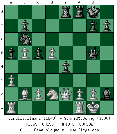 Last move : 0-1 2015 September 3 11:18:46 [Event "FICGS__CHESS__RAPID_B__000232"] [Site "FICGS"] [Date "2015.07.31"] [Round "1"] [White "Cirulis,Ilmars"] [Black "Schmidt,Jonny"] [Result "0-1"] [WhiteElo "1840"] [BlackElo "1800"] 1.b4 e5 2.a3 a5 3.b5 d5 4.Bb2 Bd6 5.Nf3 Nd7 6.e3 c5 7.Be2 f5 8.d3 Ngf6 9.e4 O-O 10.exd5 e4 11.dxe4 fxe4 12.Ng5 Nb6 13.O-O Ng4 14.Bxg4 Qxg5 15.Bxc8 Raxc8 16.Nd2 Rce8 17.Qe2 Bxh2+ 0-1 Polish (Sokolsky) opening Kingside Castling by player Black (move 9) Kingside Castling by player White (move 13) Player Black won this chess game. Follow this game move after move (download)Human affairs are like a Chess game: only those who do not take it seriously can be called good players. (Hung Tzu Ch'eng) Der zweitbeste Zug ist oft der einzig richtige. (Savielly Grigorievitsch Tartakower) Yo no creo en la psicología. Yo creo en las buenas movidas. (Bobby Fischer) Le profane ne songe pas à la somme de jouissance dont il se prive, qui méconnaît ce jeu aux ressources aussi variées que passionnantes. (Jean-Marie Jeanton-Lamarche) Men never do evil so completely and cheerfully as when they do it from religious conviction. (Blaise Pascal)
