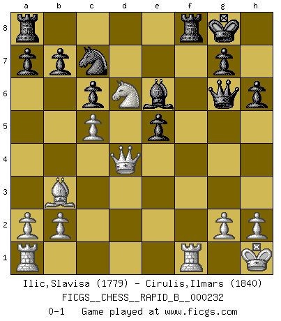 Last move : 0-1 2015 October 13 1:16:21 [Event "FICGS__CHESS__RAPID_B__000232"] [Site "FICGS"] [Date "2015.07.31"] [Round "1"] [White "Ilic,Slavisa"] [Black "Cirulis,Ilmars"] [Result "0-1"] [WhiteElo "1779"] [BlackElo "1840"] 1.e4 c6 2.d4 d5 3.f3 dxe4 4.fxe4 e5 5.Nf3 exd4 6.Bc4 Nf6 7.O-O Nbd7 8.e5 Nd5 9.Kh1 N7b6 10.Bb3 Be7 11.Qxd4 O-O 12.Qe4 Qd7 13.c4 Nb4 14.Bg5 Bxg5 15.Nxg5 Qd3 16.Qf4 Qg6 17.Nd2 Nd3 18.Qe3 h6 19.Nge4 Nxe5 20.c5 Nd5 21.Qd4 f6 22.Nd6 Be6 23.N2c4 Nc7 24.Nxe5 fxe5 0-1 This chess game has been lost on time (started : 2015.07.31 5:30:4) Caro-Kann : Tartakower (fantasy) variation Kingside Castling by player White (move 7) Kingside Castling by player Black (move 11) Player Black won this chess game. Follow this game move after move (download)I'm not a materialistic person, in that, I don't suffer the lack or loss of money. The absence of worldly goods I don't look back on. For Chess is a way I can be as materialistic as I want without having to sell my soul. (Jamie Walter Adams) Ich würde die 30 stärksten Spieler der USA im Simultanspiel besiegen. (José Raúl Capablanca) Los libros de Ajedrez deben de usarse igual como usamos los anteojos: para mejorar la vista, aunque algunos jugadores los quieren usar como si ellos les otorgaran la vision. (José Raúl Capablanca) Il vaut toujours mieux jouer un plan faux de façon logique que de n'avoir pas de plan du tout. (Victor Kortchnoï) There are 10 types of people in this world: those who understand binary and those who don't. (Anonymous)