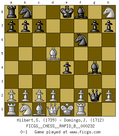 Last move : 0-1 2015 September 11 11:48:38 [Event "FICGS__CHESS__RAPID_B__000232"] [Site "FICGS"] [Date "2015.07.31"] [Round "1"] [White "Hilbert,Stephan J."] [Black "Domingo,Jordi"] [Result "0-1"] [WhiteElo "1739"] [BlackElo "1712"] 1.e4 e5 2.Nf3 f5 3.Bc4 fxe4 4.Nxe5 Qg5 5.Nf7 Qxg2 6.Rf1 d5 7.Bxd5 Nf6 8.Nxh8 Bg4 0-1 Latvian gambit, 3.Bc4 Player Black won this chess game. Follow this game move after move (download)Pawn endings are to Chess what putting is to golf. (Cecil Purdy) Ohne Fehler kann es keine Brillanz geben. (Emanuel Lasker) Uno por uno, yo los acribillé, mi superioridad muy pronto se volvio aparente. (Jose Capablanca) Il n'y a plus de joueurs du niveau de Jacob Murray dont la seule quête est le beau jeu, le plaisir de voir les pièces construire quelque chose. Sur 10 idées à la minute, 9 seront sans intérêt, la dernière s'avèrera géniale. (Christian Bauer) There is a very easy way to return from a casino with a small fortune : go there with a large one. (Jack Yelton)