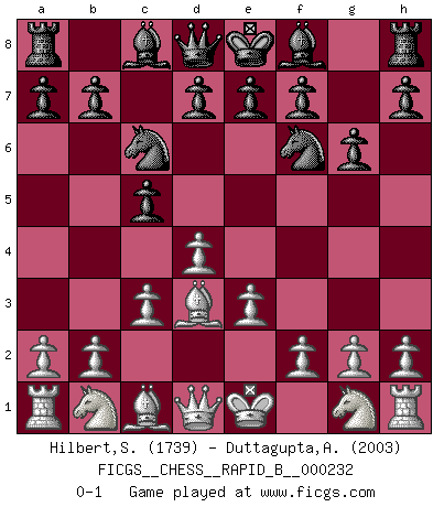 Last move : 0-1 2015 September 28 23:46:3 [Event "FICGS__CHESS__RAPID_B__000232"] [Site "FICGS"] [Date "2015.07.31"] [Round "1"] [White "Hilbert,Stephan J."] [Black "Duttagupta,Aniruddha"] [Result "0-1"] [WhiteElo "1739"] [BlackElo "2003"] 1.d4 Nf6 2.e3 g6 3.Bd3 c5 4.c3 Nc6 0-1 This chess game has been lost on time (started : 2015.07.31 5:30:4) Queen's pawn game Player Black won this chess game. Follow this game move after move (download)Morphy was probably the greatest genius of them all. (Bobby Fischer) Das Schachspiel übertrifft alle anderen Spiele so weit wie der Chimborasso einen Misthaufen. (Arthur Schopenhauer) La táctica fluye a partir de una posición superior. (Bobby Fischer) Avec des compensations pour le matériel en plus... (Anonyme) A person who never made a mistake never tried anything new. (Albert Einstein)