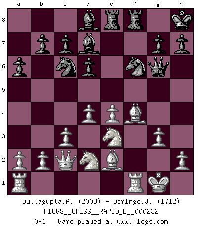 Last move : 0-1 2015 October 26 2:56:39 [Event "FICGS__CHESS__RAPID_B__000232"] [Site "FICGS"] [Date "2015.07.31"] [Round "1"] [White "Duttagupta,Aniruddha"] [Black "Domingo,Jordi"] [Result "0-1"] [WhiteElo "2003"] [BlackElo "1712"] 1.e4 e5 2.Nf3 f5 3.Nxe5 Qf6 4.d4 d6 5.Nc4 fxe4 6.Nc3 Qg6 7.f3 Be7 8.fxe4 Nh6 9.Qd3 O-O 10.Nd5 Nc6 11.g3 Ng4 12.Bf4 Be6 13.Be2 Rae8 14.O-O Bd8 15.c3 Bd7 16.Nd2 a6 17.Ne3 Nf6 18.Qc2 Kh8 0-1 This chess game has been lost on time (started : 2015.07.31 5:30:4) Latvian counter-gambit Kingside Castling by player Black (move 9) Kingside Castling by player White (move 14) Player Black won this chess game. Follow this game move after move (download)Mistrust is the most necessary characteristic of the Chess player. (Siegbert Tarrasch) Schach ist gnadenlos. Du mußt bereit sein zu töten. (Nigel Short) La captura del Rey enemigo es la finalidad pero no el primer objetivo de la partida. (William Steinitz) Le jeu d'échecs est comme rejeté hors du temps. (Antoine de Saint-Exupéry) All men can see these tactics whereby I conquer, but what none can see is the strategy out of which victory is evolved. (Sun Tzu)