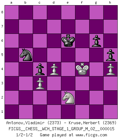 Last move : 1/2-1/2 2016 March 2 0:32:47 [Event "FICGS__CHESS__WCH_STAGE_1_GROUP_M_02__000015"] [Site "FICGS"] [Date "2015.08.01"] [Round "1"] [White "Antonov,Vladimir"] [Black "Kruse,Herbert"] [Result "1/2-1/2"] [WhiteElo "2373"] [BlackElo "2369"] 1.d4 Nf6 2.c4 e6 3.Nc3 Bb4 4.f3 d5 5.a3 Bxc3+ 6.bxc3 c5 7.cxd5 exd5 8.e3 c4 9.Ne2 Nc6 10.g4 Na5 11.Bg2 Nb3 12.Ra2 O-O 13.O-O a5 14.Nf4 Ne8 15.e4 Nc7 16.a4 b5 17.axb5 Nxb5 18.Qe1 Bb7 19.e5 Qb6 20.Ne2 Nxc1 21.Qxc1 f6 22.exf6 Qxf6 23.f4 Qg6 24.g5 a4 25.Ng3 Nd6 26.Rb2 Bc6 27.Rb6 Qe8 28.Qa3 Nc8 29.R6b1 Qe3+ 30.Kh1 Qe7 31.Qc1 Nd6 32.f5 Ne4 33.Qf4 a3 34.Rb6 a2 35.Ra1 Rfc8 36.Rb2 Qxg5 37.Qxg5 Nxg5 38.R1xa2 Rxa2 39.Rxa2 Ra8 40.Rxa8+ Bxa8 41.Kg1 Nf7 42.Nf1 Nd6 43.Ne3 Kf7 44.Bxd5+ Bxd5 45.Nxd5 Nxf5 46.Kg2 Ke6 47.Nf4+ Kd6 48.Kf3 g6 49.Kg4 Ne3+ 50.Kf3 Nf5 51.Kg4 Ne3+ 52.Kf3 Nd1 53.Ne2 Kd5 54.Nf4+ Kd6 55.Ne2 Kd5 56.Nf4+ Kc6 57.Ne2 Kd6 58.Ke4 Nf2+ 59.Kf3 Nd1 60.Ke4 h6 61.Kf3 Ke6 62.Ke4 Kd6 63.Kf3 Ke7 64.Ke4 h5 65.Kd5 Ne3+ 66.Ke4 Nd1 67.Kd5 Ne3+ 68.Ke4 Ng4 69.h4 Nf6+ 70.Ke5 Ng4+ 71.Ke4 Kf6 72.Ng3 Ke6 73.Ne2 Nf6+ 74.Kf4 Nd5+ 75.Ke4 Nf6+ 76.Kf4 Nd5+ 77.Ke4 Kd6 78.Kf3 Nc7 79.Ke4 Nd5 80.Kf3 Nc7 81.Ke4 Nb5 82.Kf4 Kd5 83.Ke3 Ke6 84.Kf4 Kd5 85.Ke3 Ke6 86.Kf4 1/2-1/2 Nimzo-Indian : Kmoch variation Kingside Castling by player Black (move 12) Kingside Castling by player White (move 13) 10 pieces endgame at move 45 : White KNPPP , Black KNPPP WHITE : King + 1 Knight 3 Pawns BLACK : King + 1 Knight 3 Pawns This chess game ended in a draw. Follow this game move after move (download)He who fears an isolated Queen's Pawn should give up Chess. (Siegbert Tarrasch) Das Zentrum ist der Balkan des Schachbretts - Kriegshandlungen können in jedem Moment ausbrechen. (Aaron Nimzowitsch) El Ajedrez moderno está demasiado preocupado con cosas como la estructura de Peones. Olvidenlo, el Jaque Mate termina la partida. (Nigel Short) Que feriez-vous si vous étiez en train de jouer aux échecs et que la fin du monde arrive ? Je continuerais à jouer. (Saint Borromée) Children in the dark cause accidents, accidents in the dark cause children. (Unknown)