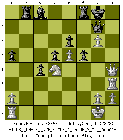 Last move : 1-0 2015 August 22 17:49:18 [Event "FICGS__CHESS__WCH_STAGE_1_GROUP_M_02__000015"] [Site "FICGS"] [Date "2015.08.01"] [Round "1"] [White "Kruse,Herbert"] [Black "Orlov,Vladimir"] [Result "1-0"] [WhiteElo "2369"] [BlackElo "2222"] 1.e4 e6 2.d4 d5 3.Nc3 Nf6 4.e5 Nfd7 5.f4 c5 6.Nf3 Nc6 7.Be3 Qb6 8.Na4 Qa5+ 9.c3 cxd4 10.b4 Nxb4 11.cxb4 Bxb4+ 12.Bd2 Bxd2+ 13.Nxd2 O-O 14.Bd3 b5 15.Nb2 Nb6 16.O-O Nc4 17.Bxh7+ Kxh7 18.Qh5+ Kg8 19.Nbxc4 bxc4 20.Nf3 g6 21.Qh6 Qc7 22.f5 f6 23.fxg6 f5 24.Nxd4 Qg7 25.Qh4 a5 26.Rf3 Rb8 27.Rh3 1-0 French : Steinitz, Boleslavsky variation Kingside Castling by player Black (move 13) Kingside Castling by player White (move 16) Player White won this chess game. Follow this game move after move (download)Spassky will not be psyched out by Fischer. (Mike Goodall) Ein Springer auf f6 gegen die eigene Rochadestellung ist schlimmer als ein rostiger Nagel im Knie. (Efim Bogoljubov) Creo que una cierta cantidad de temperamento es esperada de los genios del Ajedrez. (Ron Gross) A chaque perte on perd un peu de soi. (Joël Lautier) Optimism is a variety of information deficit. Sometimes especially true for correspondence chess games. (Michael Aigner)