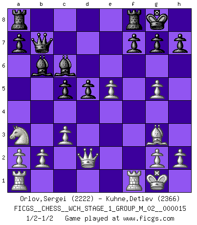 Last move : 1/2-1/2 2015 September 1 18:1:18 [Event "FICGS__CHESS__WCH_STAGE_1_GROUP_M_02__000015"] [Site "FICGS"] [Date "2015.08.01"] [Round "1"] [White "Orlov,Vladimir"] [Black "Kuhne,Detlev"] [Result "1/2-1/2"] [WhiteElo "2222"] [BlackElo "2366"] 1.e4 e5 2.Nf3 Nc6 3.Bc4 Nf6 4.d4 exd4 5.e5 d5 6.Bb5 Ne4 7.Nxd4 Bd7 8.Bxc6 bxc6 9.O-O Bc5 10.f3 Ng5 11.Be3 Bb6 12.f4 c5 13.fxg5 cxd4 14.Bxd4 c6 15.Qd2 O-O 16.c3 c5 17.Bf2 Qc7 18.Bg3 Qb7 19.Na3 Bc6 1/2-1/2 Two knights defense Kingside Castling by player White (move 9) Kingside Castling by player Black (move 15) This chess game ended in a draw. Follow this game move after move (download)Chess is 99 percent tactics. (Teichmann) Es war undenkbar für die Behörden, dass ein sowjetischer Großmeister auf diese Art und Weise [Fischer-Taimanov 6:0] verliert, ohne dass es eine politischer Erklärung dafür gäbe. (Mark Taimanov) Me gusta decir que Bobby Fischer fue el mejor jugador que jamás haya existido. Pero lo que hizo de Fischer un genio, fue su habilidad de mezclar una frescura y pragmatismo Americano con ideas Rusas acerca de la estrategia. (Bruce Pandolfini) J'apprécie les joueurs d'est-indienne, c'est grâce à eux que je nourris ma famille depuis tant d'années. (Petrosian) First of all, we have to go back to the classical time control. (Anatoly Karpov)