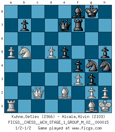 Last move : 1/2-1/2 2015 October 16 4:6:6 [Event "FICGS__CHESS__WCH_STAGE_1_GROUP_M_02__000015"] [Site "FICGS"] [Date "2015.08.01"] [Round "1"] [White "Kuhne,Detlev"] [Black "Alcala,Alvin"] [Result "1/2-1/2"] [WhiteElo "2366"] [BlackElo "2103"] 1.d4 Nf6 2.c4 g6 3.Nc3 Bg7 4.e4 O-O 5.Nf3 d6 6.Be2 e5 7.O-O Nc6 8.d5 Ne7 9.b4 Ne8 10.c5 f5 11.Nd2 Nf6 12.f3 f4 13.Nc4 g5 14.a4 Ng6 15.Ba3 Rf7 16.b5 dxc5 17.Bxc5 h5 18.a5 g4 19.b6 g3 20.Kh1 Bf8 21.d6 axb6 22.Bg1 Be6 23.dxc7 Qxc7 24.Nb5 Qe7 25.Nxb6 Rd8 26.Qc2 Nh4 27.Rfd1 Ng4 28.Nd5 Bxd5 29.Rxd5 Rxd5 30.exd5 1/2-1/2 King's Indian : 4.e4 Kingside Castling by player Black (move 4) Kingside Castling by player White (move 7) This chess game ended in a draw. Follow this game move after move (download)All Chess players should have a hobby. (Savielly Tartakower) Gegen einen Schachcomputer zu verlieren ist wie Löcher in den Strümpfen zuhaben. Es ist nicht peinlich, solange man der einzige ist der es weiß. (Anonymous) La pasion por jugar al Ajedrez es una de las mas inexplicables en el mundo. (H.G. Wells) La conception d'un plan est le processus par lequel un joueur exploite les avantages de sa position tout en s'efforçant d'en réduire au minimum les inconvénients. Afin de garantir le succès, un plan doit toujours se fonder sur un diagnostic objectif des particularités d'une position. La conception d'un plan est d'autant plus difficile que la position est équilibrée, et grandement facilitée lorsqu'il n'existe qu'un seul plan susceptible de répondre aux exigences de la position. (Harry Golombek) I don't diet. I just don't eat as much as I'd like to. (Linda Evangelista, supermodel)