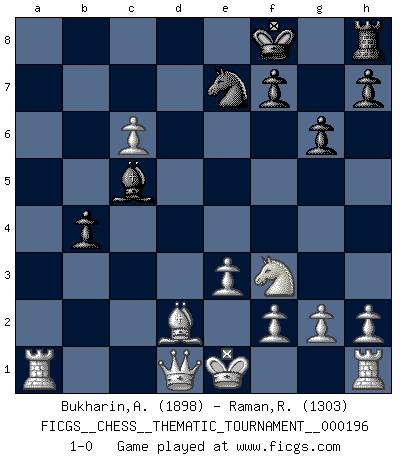 Last move : 1-0 2015 November 10 18:23:9 [Event "FICGS__CHESS__THEMATIC_TOURNAMENT__000196"] [Site "FICGS"] [Date "2015.08.01"] [Round "1"] [White "Bukharin,Alexey"] [Black "Raman,Ranganathan"] [Result "1-0"] [WhiteElo "1898"] [BlackElo "1303"] 1.d4 d5 2.c4 e6 3.Nc3 c6 4.Nf3 dxc4 5.e3 b5 6.a4 Qa5 7.Bd2 Qb6 8.axb5 cxb5 9.b3 Nc6 10.bxc4 b4 11.Na4 Qc7 12.d5 exd5 13.cxd5 Nd8 14.Bb5+ Bd7 15.Bxd7+ Qxd7 16.Nb6 Qb5 17.Nxa8 Bc5 18.Nc7+ Kf8 19.Nxb5 g6 20.Nxa7 Ne7 21.Nc6 Ndxc6 22.dxc6 1-0 QGD : Semi-Slav, Noteboom variation Player White won this chess game. Follow this game move after move (download)Chess is a part of culture and if a culture is declining then Chess too will decline. (Mikhail Botvinnik) Wenn Du nicht kämpfst, um anderen etwas zu beweisen, sondern nur für Dich selbst, dann bist du fast unbesiegbar. (Garry Kasparov) Para mi, el Ajedrez es la vida y cada partida es como una nueva vida. Todo jugador de Ajedrez suele vivir muchas vidas durante su vida. (Eduard Gufeld) J'apprécie les joueurs d'est-indienne, c'est grâce à eux que je nourris ma famille depuis tant d'années. (Petrosian) A belief is an idea the mind possesses, an idea that possesses the mind. (Robert Oxden Bolton)
