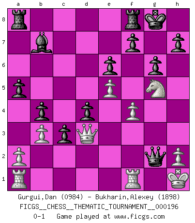 Last move : 0-1 2015 September 29 14:40:43 [Event "FICGS__CHESS__THEMATIC_TOURNAMENT__000196"] [Site "FICGS"] [Date "2015.08.01"] [Round "1"] [White "Gurgui,Dan"] [Black "Bukharin,Alexey"] [Result "0-1"] [WhiteElo "0984"] [BlackElo "1898"] 1.d4 d5 2.c4 e6 3.Nc3 c6 4.Nf3 dxc4 5.e4 b5 6.b3 Qa5 7.Bd2 b4 8.Na4 c3 9.Be3 Nf6 10.Bd3 Qc7 11.O-O Nbd7 12.Qc2 Bb7 13.Bc4 Be7 14.e5 Nd5 15.Bxd5 cxd5 16.Nb2 a5 17.Nd3 O-O 18.Nc5 Nxc5 19.dxc5 Bxc5 20.Ng5 g6 21.Bxc5 Qxc5 22.Kh1 d4 23.f4 Qd5 24.Qd3 Qxg2+ 0-1 QGD : Semi-Slav, Noteboom variation Kingside Castling by player White (move 11) Kingside Castling by player Black (move 17) Player Black won this chess game. Follow this game move after move (download)Chess teaches you to control the initial excitement you feel when you see something that looks good and it trains you to think objectively when you're in trouble. (Stanley Kubrick) Capablanka war das größte Genie der Schachgeschichte! Aber denken sie nicht er habe nichts vom Schach verstanden. Er wusste nur soviel wie er wissen musste um seine Ziele zu erreichen. (Mikhail Moiseyevich Botvinik) Del Ajedrez se ha dicho que la vida no es lo suficientemente larga para él, pero eso es culpa de la vida, no del Ajedrez. (William Ewart Napier) Aidez vos pièces, elles vous aideront. (Paul Morphy) Beta. Software undergoes beta testing shortly before it's released. Beta is latin for still doesn't work. (Anonymous)