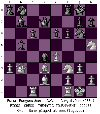 Last move : 0-1 2015 November 11 18:23:46 [Event "FICGS__CHESS__THEMATIC_TOURNAMENT__000196"] [Site "FICGS"] [Date "2015.08.01"] [Round "1"] [White "Raman,Ranganathan"] [Black "Gurgui,Dan"] [Result "0-1"] [WhiteElo "1303"] [BlackElo "0984"] 1.d4 d5 2.c4 e6 3.Nc3 c6 4.Nf3 dxc4 5.e4 Bb4 6.Bxc4 Ne7 7.O-O O-O 8.Ne2 b5 9.Bd3 a6 10.Ng3 Bb7 11.a3 Ba5 12.b4 Bb6 13.Be3 f6 14.Qb3 Qd7 15.Nh5 Ng6 16.Rac1 a5 17.bxa5 Rxa5 18.Bd2 Ra8 19.g3 Bxd4 0-1 QGD : Semi-Slav, Noteboom variation Kingside Castling by player White (move 7) Kingside Castling by player Black (move 7) Player Black won this chess game. Follow this game move after move (download)Best by test: 1. e4 (Bobby Fischer) Fischer machte Schach einfach zu einer aufregenden Sache, wann immer er sich ans Brett setzte. (Raymond Keene) Todo se encuentra en un estado de flujo y esto incluye al mundo del Ajedrez. (Mikhail Botvinnik) Un journaliste : 'Vous préférez avoir une dame de plus sur l'échiquier ou au lit ?' Boris Spassky : 'Ca dépend de la position.' In theory there is no difference between theory and practice. In practice there is. (Yogi Berra)