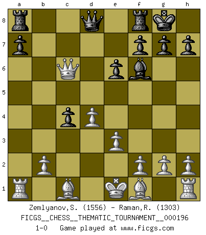 Last move : 1-0 2015 November 13 6:54:3 [Event "FICGS__CHESS__THEMATIC_TOURNAMENT__000196"] [Site "FICGS"] [Date "2015.08.01"] [Round "1"] [White "Zemlyanov,Sergey"] [Black "Raman,Ranganathan"] [Result "1-0"] [WhiteElo "1556"] [BlackElo "1303"] 1.d4 d5 2.c4 e6 3.Nc3 c6 4.Nf3 dxc4 5.e3 b5 6.a4 Bd7 7.Ne5 Bd6 8.Ne4 Be7 9.Qf3 Nf6 10.axb5 O-O 11.bxc6 Nxc6 12.Nxc6 Bxc6 13.Nxf6+ Bxf6 14.Qxc6 1-0 QGD : Semi-Slav, Noteboom variation Kingside Castling by player Black (move 10) Player White won this chess game. Follow this game move after move (download)It is no time to be playing Chess when the house is on fire. (Italian Proverb) Alle Schachspieler sollten auch ein Hobby haben. (Savielly Grigorievitsch Tartakower) Aún el Rey más flojo huye despavorido ante la amenaza de un Jaque doble. (Aaron Nimzowitsch) Ce qui caractérise les parties de combat, c'est que si le défenseur a constamment de difficiles problèmes à résoudre, l'attaquant doit chercher sans relâche de nouvelles possibilités d'attaque. (Koblentz) Luck never gives; it only lends. (Swedish proverb)