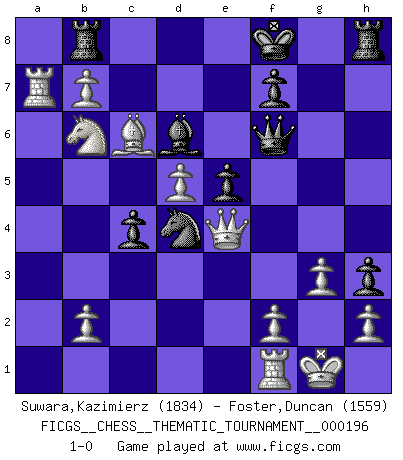 Last move : 1-0 2015 December 26 14:3:52 [Event "FICGS__CHESS__THEMATIC_TOURNAMENT__000196"] [Site "FICGS"] [Date "2015.08.01"] [Round "1"] [White "Suwara,Kazimierz"] [Black "Foster,Duncan"] [Result "1-0"] [WhiteElo "1834"] [BlackElo "1559"] 1.d4 d5 2.c4 e6 3.Nc3 c6 4.Nf3 dxc4 5.Bg5 Nf6 6.e4 b5 7.e5 h6 8.Bh4 g5 9.exf6 gxh4 10.Ne5 Qxf6 11.g3 Bd6 12.Qe2 a6 13.Bg2 Bb7 14.O-O Nd7 15.Nxc6 Bxc6 16.Bxc6 Ra7 17.d5 Rc7 18.a4 Ke7 19.axb5 Ne5 20.Rxa6 Nf3+ 21.Kg2 Nd4 22.Qe4 e5 23.b6 h3+ 24.Kxh3 R7c8 25.Ra7+ Kf8 26.b7 Rb8 27.Kg2 h5 28.Na4 h4 29.Nb6 h3+ 30.Kg1 1-0 QGD : Semi-Slav, Noteboom variation Kingside Castling by player White (move 14) Player White won this chess game. Follow this game move after move (download)Man is a frivolous, a specious creature, and like a Chess player, cares more for the process of attaining his goal than for the goal itself. (Dostoyevsky) Ich trinke, ich rauche, ich spiele, ich liebe Frauen aber Fernschach ist ein Laster, das ich nicht habe. (Mikhail Nekhemyevich Tal) ¿Quién es tu oponente esta tarde? Esta tarde mi oponente son las piezas negras. (Akiba Rubinstein) Je crois qu'il existe des manières très spécifiques de jouer efficacement contre une machine. Evidemment, nous n'avons aucune chance en technique pure, parce que l'ordinateur calcule de manière parfaite. Mais lorsque nous faisons appel à notre cerveau, en utilisant l'intuition et la compréhension, alors nous restons beaucoup plus forts. (Anatoli Karpov) Statistics can be made to prove anything - even the truth. (Author unknown)