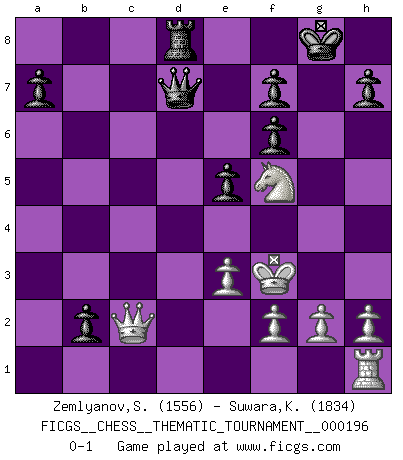 Last move : 0-1 2016 March 5 5:39:5 [Event "FICGS__CHESS__THEMATIC_TOURNAMENT__000196"] [Site "FICGS"] [Date "2015.08.01"] [Round "1"] [White "Zemlyanov,Sergey"] [Black "Suwara,Kazimierz"] [Result "0-1"] [WhiteElo "1556"] [BlackElo "1834"] 1.d4 d5 2.c4 e6 3.Nc3 c6 4.Nf3 dxc4 5.e3 b5 6.a4 Bb4 7.Bd2 Qe7 8.axb5 Bxc3 9.Bxc3 cxb5 10.d5 Nf6 11.d6 Qb7 12.b3 Nbd7 13.bxc4 b4 14.Bxf6 gxf6 15.Ra5 Rb8 16.c5 b3 17.Rb5 Qa8 18.Be2 Rxb5 19.Bxb5 O-O 20.c6 Qb8 21.cxd7 Qxb5 22.dxc8Q Rxc8 23.Nd4 Qa5+ 24.Ke2 b2 25.d7 Rd8 26.Qb3 Qa6+ 27.Kf3 e5 28.Nf5 Qe6 29.Qc2 Qxd7 0-1 This chess game has been lost on time (started : 2015.08.01 4:8:22) QGD : Semi-Slav, Noteboom variation Kingside Castling by player Black (move 19) Promotion Queen by player White (move 22) Player Black won this chess game. Follow this game move after move (download)It is no time to be playing Chess when the house is on fire. (Italian Proverb) Taktik ist was man tun muß, wenn etwas zu tun ist. Strategie ist was man tun muß, wenn nichts zu tun ist. (Savielly Grigorievitsch Tartakower) En el Ajedrez, cuando menos, el valiente hereda la tierra. (Edmar Mednis) Les Echecs ne sont pas pour les âmes timides. Ils requièrent un homme entier, qui ne s'arrête pas aveuglément à ce qui a été déjà établi, mais qui tente individuellement de sonder les profondeurs du jeu. (W. Steinitz) Life is like a game of cards: the hand you are dealt represents determinism; the way you play it is free will. (Jawaharlal Nehru)