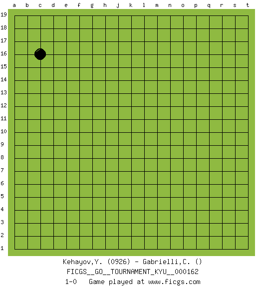 Last move : 1-0 2015 September 9 22:55:3 [Event "FICGS__GO__TOURNAMENT_KYU__000162"] [Site "FICGS"] [Date "2015.08.01"] [Round "1"] [Black "Kehayov,Yulian"] [White "Gabrielli,Cristian"] [Result "1-0"] [Rating 1 "0926"] 1.c16 1-0 This go game has been lost on time (started : 2015.08.01 5:1:54) Here are the names of the openings (joseki) played in the four corners : Player Black won this Go (weiqi, baduk) game. Follow this game move after move (download)The strong player plays straight, the weak diagonally. (Anonymous) I've never seen so many men wasted so badly. (Blondie in The Good, The Bad and The Ugly)