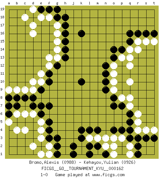 Last move : 1-0 2015 November 27 9:4:15 [Event "FICGS__GO__TOURNAMENT_KYU__000162"] [Site "FICGS"] [Date "2015.08.01"] [Round "1"] [Black "Bromo,Alexis"] [White "Kehayov,Yulian"] [Result "1-0"] [Rating 1 "0988"] [Rating 2 "0926"] 1.q16 c4 2.q4 d16 3.k4 g17 4.k16 q10 5.k10 d10 6.f7 q8 7.o7 q12 8.o13 f13 9.g12 f12 10.f11 e11 11.f10 e10 12.e9 d9 13.d8 c9 14.c8 b9 15.b8 a9 16.a8 e5 17.e6 d6 18.d7 c6 19.f5 e4 20.f4 e3 21.f3 f2 22.g2 e1 23.g1 f1 24.g3 d2 25.h17 g16 26.h16 g15 27.h15 g14 28.h14 g13 29.h13 r6 30.q6 q7 31.p7 p8 32.o8 q14 33.q15 q13 34.p14 r5 35.q5 r4 36.r3 s4 37.s3 t4 38.t3 o9 39.n9 o10 40.n10 o11 41.n11 o12 42.n12 r15 43.r16 s15 44.s16 t15 45.t16 r14 46.g18 f18 47.h18 p13 48.o14 b6 49.f19 e18 50.e19 d19 51.g19 d17 52.b7 c18 53.a6 a5 54.a7 b4 55.e7 p3 56.q3 n3 57.p4 o3 58.o4 l3 59.k3 k2 60.j2 k1 61.l4 m3 62.m4 q2 63.r2 q1 64.r1 o2 65.m2 o1 66.l2 m1 67.j1 n2 68.l1 pass 69.n1 1-0 Here are the names of the openings (joseki) played in the four corners : Corner d4 : c4 f7 Komoku (Somok, Xiao~mu`) 3-4 Point. The komoku (3-4) point is the traditional corner enclosure move.. Corner q4 : q4 q8 Hoshi (Hwajeom, Seongjeom, Xingwei`) 4-4 Point. The star or hoshi (4-4) point, emphasizing influence at the potential expense of territory. Corner q16 : q16 q12 Hoshi (Hwajeom, Seongjeom, Xingwei`) 4-4 Point. The star or hoshi (4-4) point, emphasizing influence at the potential expense of territory. Player Black won this Go (weiqi, baduk) game. Follow this game move after move (download)Don't make compact groups of stones. (Anonymous) If everyone is thinking alike, then somebody isn't thinking. (US General George S. Patton)