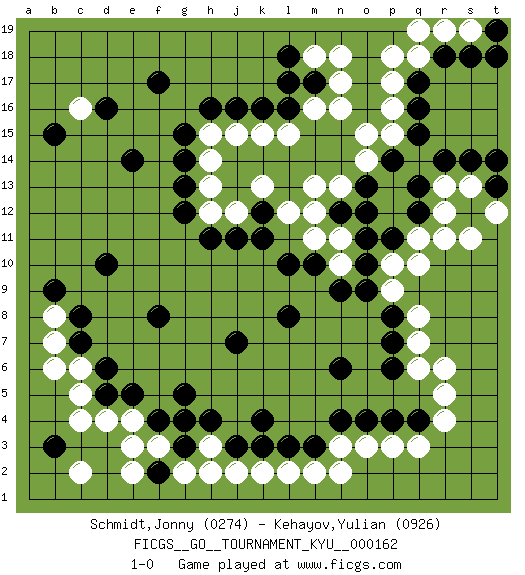 Last move : 1-0 2016 February 23 15:56:54 [Event "FICGS__GO__TOURNAMENT_KYU__000162"] [Site "FICGS"] [Date "2015.08.01"] [Round "1"] [Black "Schmidt,Jonny"] [White "Kehayov,Yulian"] [Result "1-0"] [Rating 1 "0274"] [Rating 2 "0926"] 1.d16 c4 2.q16 q3 3.d5 c5 4.d6 c6 5.c7 d4 6.e5 e4 7.g3 p17 8.q17 p16 9.q15 p15 10.p14 o15 11.l16 m16 12.q4 p3 13.p4 o3 14.d10 q10 15.p11 p10 16.o11 q11 17.q12 q8 18.p7 q7 19.p6 r6 20.k4 l15 21.k16 k15 22.j16 j15 23.h16 h15 24.g15 e3 25.m3 b7 26.c8 b8 27.f4 f3 28.g5 r12 29.q13 r13 30.r14 s13 31.o10 p9 32.o9 r4 33.b9 b6 34.o4 n3 35.n4 n2 36.m17 n16 37.b3 c2 38.f2 e2 39.e14 h12 40.j11 j12 41.k12 k13 42.g13 h13 43.g14 h14 44.f17 n17 45.l18 m18 46.l17 n18 47.g12 l12 48.k11 m12 49.n12 n13 50.h11 n11 51.o12 m11 52.l10 o14 53.o13 q18 54.r18 q19 55.s14 r11 56.m10 n10 57.n9 r5 58.p8 q6 59.t13 t12 60.t14 s11 61.n6 g2 62.l8 h3 63.g4 h2 64.h4 m2 65.l3 l2 66.j3 j2 67.j7 k2 68.k3 r19 69.s18 s19 70.t19 p18 71.t18 m13 72.f8 c16 73.b15 1-0 This go game has been lost on time (started : 2015.08.01 5:1:54) Here are the names of the openings (joseki) played in the four corners : Corner d4 : c4 d5 Komoku (Somok, Xiao~mu`) 3-4 Point. The komoku (3-4) point is the traditional corner enclosure move.. Corner q16 : q16 p17 Hoshi (Hwajeom, Seongjeom, Xingwei`) 4-4 Point. The star or hoshi (4-4) point, emphasizing influence at the potential expense of territory. Corner q4 : q3 q4 Komoku (Somok, Xiao~mu`) 3-4 Point. The komoku (3-4) point is the traditional corner enclosure move.. Player Black won this Go (weiqi, baduk) game. Follow this game move after move (download)Take the cutting stone on the second line. (Anonymous) A government big enough to give you everything you want is strong enough to take everything you have. (Thomas Jefferson)
