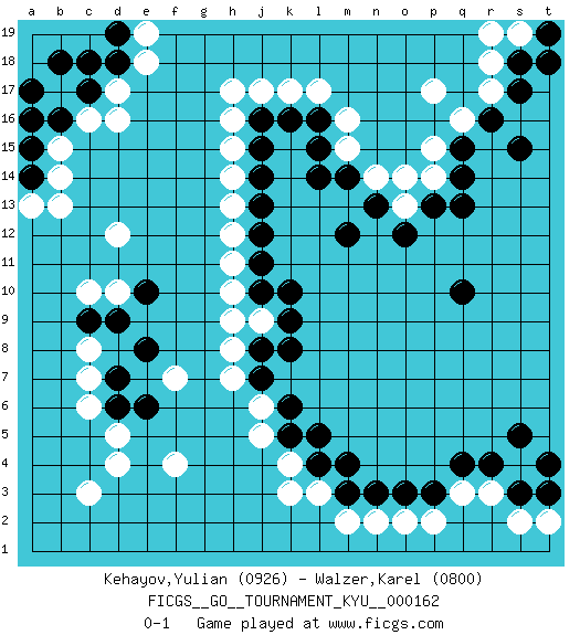 Last move : 0-1 2015 November 18 20:6:35 [Event "FICGS__GO__TOURNAMENT_KYU__000162"] [Site "FICGS"] [Date "2015.08.01"] [Round "1"] [Black "Kehayov,Yulian"] [White "Walzer,Karel"] [Result "0-1"] [Rating 1 "0926"] [Rating 2 "0800"] 1.r16 d16 2.q4 d4 3.q10 p17 4.k16 d10 5.n3 k3 6.k10 p15 7.q13 m16 8.m14 h16 9.j15 h15 10.j14 r17 11.q15 p14 12.q14 q16 13.s15 f4 14.l4 k4 15.l5 r3 16.r4 q3 17.p3 s4 18.s5 p2 19.o3 o2 20.p13 n14 21.n13 o13 22.o12 o14 23.m12 h8 24.k8 h12 25.c17 d17 26.c18 c16 27.d18 e18 28.b16 b15 29.a17 c3 30.b18 k17 31.l15 l17 32.l16 j6 33.k6 j5 34.k5 l3 35.m4 n2 36.m3 m2 37.j10 h10 38.c9 c10 39.d9 c7 40.d7 c6 41.d6 d5 42.e6 f7 43.e8 c8 44.j12 h11 45.j11 h14 46.j13 h13 47.s17 r18 48.s18 m15 49.l14 j17 50.a15 b14 51.a14 a13 52.a16 b13 53.e10 d12 54.s3 s2 55.t4 t2 56.t3 j9 57.k9 s19 58.j8 h9 59.j7 h7 60.t18 r19 61.d19 e19 62.j16 h17 63.t19 pass 0-1 Here are the names of the openings (joseki) played in the four corners : Corner q16 : r16 p17 Komoku (Somok, Xiao~mu`) 3-4 Point. The komoku (3-4) point is the traditional corner enclosure move.. Ikken Kakari (Hankan Keolch'im, Yi Gua`jiao~, 1-Space Low Pincer). The small knight move is the basic approach move to the 3-4 point stone. It has been continually used for over four centuries. There are limitless variations, with new moves constantly being discovered. White 2 opens the door to a treaure store of joseki. Player White won this Go (weiqi, baduk) game. Follow this game move after move (download)If you have won four corners, resign. (Anonymous) If we knew what we were doing, we would not call it research. (Albert Einstein)