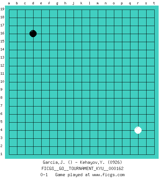 Last move : 0-1 2015 September 22 11:23:39 [Event "FICGS__GO__TOURNAMENT_KYU__000162"] [Site "FICGS"] [Date "2015.08.01"] [Round "1"] [Black "Garcia,Jorge Luis"] [White "Kehayov,Yulian"] [Result "0-1"] [Rating 2 "0926"] 1.d16 r4 0-1 This go game has been lost on time (started : 2015.08.01 5:1:54) Here are the names of the openings (joseki) played in the four corners : Corner q4 : r4 0-1 Komoku (Somok, Xiao~mu`) 3-4 Point. The komoku (3-4) point is the traditional corner enclosure move.. Player White won this Go (weiqi, baduk) game. Follow this game move after move (download)While the Baroque rules of chess could only have been created by humans, the rules of go are so elegant, organic, and rigorously logical that if intelligent life forms exist elsewhere in the universe, they almost certainly play go. (Edward Lasker, international chess master) If things go wrong, don't go with them. (Roger Babson)