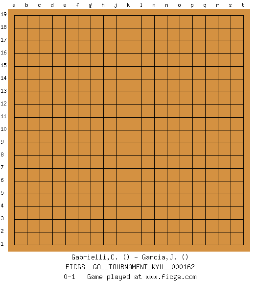 Last move : 0-1 2015 August 31 10:4:45 [Event "FICGS__GO__TOURNAMENT_KYU__000162"] [Site "FICGS"] [Date "2015.08.01"] [Round "1"] [Black "Gabrielli,Cristian"] [White "Garcia,Jorge Luis"] [Result "0-1"] 0-1 This go game has been lost on time (started : 2015.08.01 5:1:54) Here are the names of the openings (joseki) played in the four corners : Player White won this Go (weiqi, baduk) game. Follow this game move after move (download)A knight's move near the edge of the board cannot be cut. (Bill Taylor) All battles are fought by scared men who'd rather be someplace else. (John Wayne in the movie In harm's way)