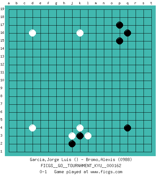 Last move : 0-1 2015 September 26 23:29:16 [Event "FICGS__GO__TOURNAMENT_KYU__000162"] [Site "FICGS"] [Date "2015.08.01"] [Round "1"] [Black "Garcia,Jorge Luis"] [White "Bromo,Alexis"] [Result "0-1"] [Rating 2 "0988"] 1.q4 d16 2.p17 d4 3.q16 k16 4.p15 k4 5.k3 j3 6.j2 l3 0-1 This go game has been lost on time (started : 2015.08.01 5:1:54) Here are the names of the openings (joseki) played in the four corners : Corner q4 : q4 l3 Hoshi (Hwajeom, Seongjeom, Xingwei`) 4-4 Point. The star or hoshi (4-4) point, emphasizing influence at the potential expense of territory. Player White won this Go (weiqi, baduk) game. Follow this game move after move (download)Go is not a blocking game, it's a game of action. (Pierre Audouard) Children in the dark cause accidents, accidents in the dark cause children. (Unknown)