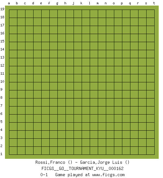 Last move : 0-1 2015 August 31 10:4:45 [Event "FICGS__GO__TOURNAMENT_KYU__000162"] [Site "FICGS"] [Date "2015.08.01"] [Round "1"] [Black "Rossi,Franco"] [White "Garcia,Jorge Luis"] [Result "0-1"] 0-1 This go game has been lost on time (started : 2015.08.01 5:1:54) Here are the names of the openings (joseki) played in the four corners : Player White won this Go (weiqi, baduk) game. Follow this game move after move (download)The second line is the line of defeat, the third line is the line of territory, and the fourth line is the line of influence. (Anonymous) A good player is always lucky. (Capablanca)