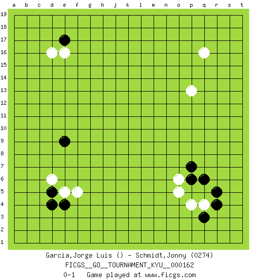 Last move : 0-1 2015 September 29 23:47:13 [Event "FICGS__GO__TOURNAMENT_KYU__000162"] [Site "FICGS"] [Date "2015.08.01"] [Round "1"] [Black "Garcia,Jorge Luis"] [White "Schmidt,Jonny"] [Result "0-1"] [Rating 2 "0274"] 1.d4 q4 2.e17 q16 3.q6 e5 4.e4 f5 5.d5 d16 6.r5 o5 7.q3 p4 8.r4 e16 9.p6 o6 10.p7 d6 11.e9 p13 0-1 This go game has been lost on time (started : 2015.08.01 5:1:54) Here are the names of the openings (joseki) played in the four corners : Corner q4 : q4 q6 Hoshi (Hwajeom, Seongjeom, Xingwei`) 4-4 Point. The star or hoshi (4-4) point, emphasizing influence at the potential expense of territory. Ikken Takagakari (Hankan Nop'dakeolch'im, Yi Gaojia, 1-Space High Approach). White typically responds at 6-4 or 3-10. White 4-10 is played when White finds play on the right side advantageous. White 4-8 or 3-8 may be played when White has support at top. Corner d4 : d4 e5 Hoshi (Hwajeom, Seongjeom, Xingwei`) 4-4 Point. The star or hoshi (4-4) point, emphasizing influence at the potential expense of territory. Corner d16 : e17 d16 Mokuhazushi (Waemok, Wai`mu`) 5-3 Point. The mokuhazushi (5-3) point was popular in the Edo period in Japan (1600 - 1867). It emphasizes influence; territorially, it is inferior to the 3-4 point. Player White won this Go (weiqi, baduk) game. Follow this game move after move (download)You don't have to be really good anymore to get good results. What's happening with chess is that it's gradually losing its place as the par excellence of intellectual activity. Smart people in search of a challenging board game might try a game called Go. (Hans Berliner, The New York Times, 2003) Fortune favours the audacious. (Desiderius Erasmus)