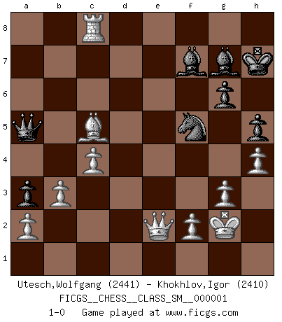 Last move : 1-0 2006 November 29 14:0:44 [Event "FICGS__CHESS__CLASS_SM__000001"] [Site "FICGS"] [Date "2006.05.30"] [Round "1"] [White "Utesch,Wolfgang"] [Black "Khokhlov,Igor"] [Result "1-0"] [WhiteElo "2441"] [BlackElo "2410"] 1.e4 e6 2.Qe2 c5 3.Nf3 Nc6 4.g3 g6 5.Bg2 Bg7 6.O-O Nge7 7.d3 d5 8.c3 O-O 9.e5 Qc7 10.Bf4 Bd7 11.Nbd2 b5 12.Nb3 c4 13.Nc5 cxd3 14.Nxd3 a5 15.Bg5 Kh8 16.Qd2 Ng8 17.Rfe1 h6 18.Be3 Rfc8 19.h4 a4 20.Bc5 Na5 21.Qf4 Be8 22.Nd4 Nc4 23.Bb4 Qd8 24.Rad1 Na5 25.Bh3 Nc6 26.Nxe6 fxe6 27.Bxe6 Nge7 28.Bxc8 Qxc8 29.Ba3 Nf5 30.e6 h5 31.Nb4 Nxb4 32.Bxb4 Ra6 33.e7 Rf6 34.Qe5 Rd6 35.Qe2 Rd7 36.Qxb5 Rxe7 37.Qxd5 Rxe1+ 38.Rxe1 Kh7 39.Re4 Nh6 40.Rc4 Qb8 41.Qd6 Qa8 42.Rc7 Bf7 43.Qf4 Kg8 44.c4 a3 45.b3 Nf5 46.Bc5 Bh6 47.Qe5 Bg7 48.Qe2 Qa5 49.Rc8+ Kh7 50.Kg2 1-0 French : Chigorin variation Kingside Castling by player White (move 6) Kingside Castling by player Black (move 8) Player White won this chess game. Follow this game move after move (download)If your opponent offers you a draw, try to work out why he thinks he's worse off. (Nigel Short) Das Zentrum ist der Balkan des Schachbretts - Kriegshandlungen können in jedem Moment ausbrechen. (Aaron Nimzowitsch) Si el Ajedrez es una ciencia, es la mas inexacta. Si el Ajedrez es un arte, es demasiado inexacto para ser visto como tal. Si el Ajedrez es un deporte, es demasiado esotérico. Si el Ajedrez es un juego, es demasiado exigente para ser solo un juego. Si el Ajedrez es una aventura, es una muy demandante. Si el Ajedrez es una pasión, es una muy gratificante. Si el Ajedrez es la vida, es una muy triste. (Anónimo) Nous sommes les pions de la mystérieuse partie d'Echecs jouée par Dieu. Il nous déplace, nous arrête, nous pousse encore, puis nous lance un à un dans la boîte du Néant. Epitaphe sur la tombe de David Janowsky (1868-1927). When you don't know what to do, walk fast and look worried. (Anonymous)
