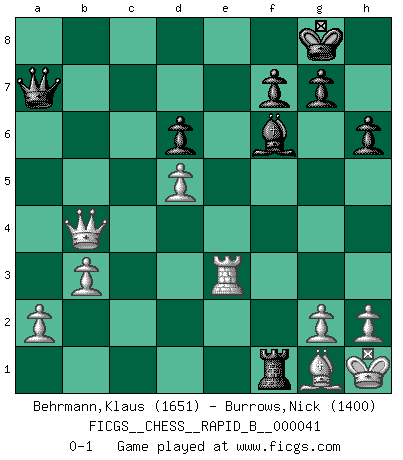 Last move : 0-1 2007 April 13 8:6:8 [Event "FICGS__CHESS__RAPID_B__000041"] [Site "FICGS"] [Date "2007.03.09"] [Round "1"] [White "Behrmann,Klaus"] [Black "Burrows,Nick"] [Result "0-1"] [WhiteElo "1651"] [BlackElo "1400"] 1.e4 c5 2.d4 cxd4 3.Nf3 d6 4.Nxd4 Nf6 5.Nc3 a6 6.f3 e5 7.Nb3 Be6 8.Nd5 Nxd5 9.exd5 Bf5 10.Bd3 Bxd3 11.Qxd3 Be7 12.O-O Nd7 13.Be3 O-O 14.f4 Re8 15.c3 Bf6 16.Rae1 exf4 17.Rxf4 Ne5 18.Qf1 Ng6 19.Rf2 Qd7 20.Nd2 Rac8 21.Rfe2 Qb5 22.c4 Qd7 23.b3 b5 24.Rc1 h6 25.Kh1 Re7 26.Bg1 Rxe2 27.Qxe2 Bg5 28.Rc2 Re8 29.Qf1 Nh4 30.Nf3 Nxf3 31.Qxf3 Re1 32.Re2 Rc1 33.cxb5 axb5 34.Qd3 Bf6 35.Qd2 Rc3 36.Re3 b4 37.Qe2 Rc1 38.Qd2 Rf1 39.Qxb4 Qa7 0-1 Sicilian : Smith-Morra gambit Kingside Castling by player White (move 12) Kingside Castling by player Black (move 13) Player Black won this chess game. Follow this game move after move (download)The defensive power of a pinned piece is only imaginary. (Aaron Nimzovich) Frage: Wie viele Autos haben Sie schon zerstört? - Antwort: Nur zwei. (Loek van Wely) Ciertamente, de todas la drogas del mundo, el Ajedrez debe ser el mas placentero permamentemente. (Assiac) Ce n'est pas pour s'amuser qu'il joue aux échecs : il célèbre un culte. (Vladimir Nabokov) Horse racing is animated roulette. (Roger Kahn)