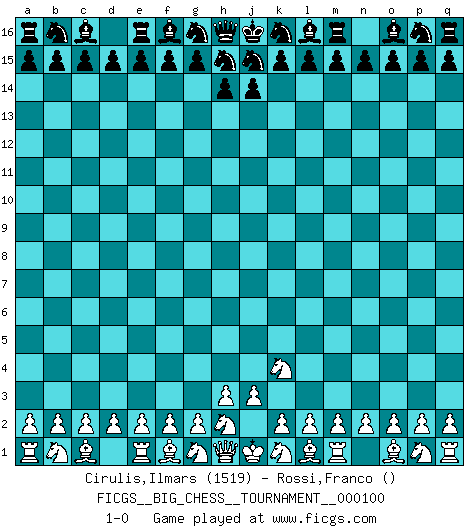 Last move : 1-0 2015 September 6 10:32:37 [Event "FICGS__BIG_CHESS__TOURNAMENT__000100"] [Site "FICGS"] [Date "2015.08.03"] [Round "1"] [White "Cirulis,Ilmars"] [Black "Rossi,Franco"] [Result "1-0"] [WhiteElo "1519"] [BlackElo ""] 1.j2-k4 1-0 This big chess game has been lost on time (started : 2015.08.03 21:6:56) Follow this game move after move (download)Chess, like love, like music, has the power to make people happy. (Siegbert Tarrasch) Heutzutage gewinnt im Turnier nicht derjenige Spieler, der weitreichende Pläne entwirft, sondern einfach jener, der Zug um Zug kämpft. (David Bronstein) No todos los artistas son jugadores de Ajedrez, pero todos los jugadores de Ajedrez son artistas. (Marcel Duchamp) Les échecs, c'est l'art d'analyser. (Mikhail Botvinnik) Life is like a game of cards: the hand you are dealt represents determinism; the way you play it is free will. (Jawaharlal Nehru)