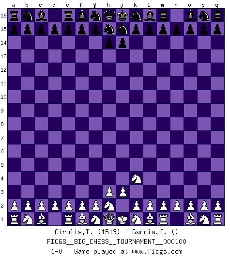 Last move : 1-0 2015 September 21 11:17:26 [Event "FICGS__BIG_CHESS__TOURNAMENT__000100"] [Site "FICGS"] [Date "2015.08.03"] [Round "1"] [White "Cirulis,Ilmars"] [Black "Garcia,Jorge Luis"] [Result "1-0"] [WhiteElo "1519"] [BlackElo ""] 1.j2-k4 1-0 This big chess game has been lost on time (started : 2015.08.03 21:6:56) Follow this game move after move (download)Life is a kind of Chess, with struggle, competition, good and ill events. (Benjamin Franklin) Woher wissen wir, daß der Neanderthaler Blindschach gespielt hat? -- Bei Ausgrabungen wurden keine Schachbretter und Figuren gefunden. (Anonymous) Una buena ofensiva y una buena defensa, comienzan ambas con un buen desarrollo. (Bruce A. Moon) Les sacrifices démontrent seulement que quelqu'un a gaffé. (Savielly Tartacover) You can't play chess if you're groggy from pills. (Anatoly Karpov)