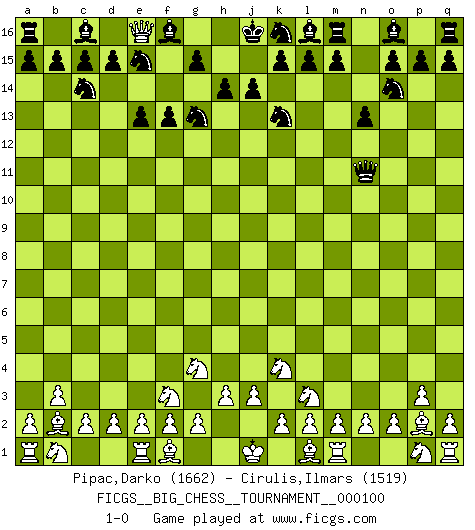 Last move : 1-0 2015 August 18 20:27:56 [Event "FICGS__BIG_CHESS__TOURNAMENT__000100"] [Site "FICGS"] [Date "2015.08.03"] [Round "1"] [White "Pipac,Darko"] [Black "Cirulis,Ilmars"] [Result "1-0"] [WhiteElo "1662"] [BlackElo "1519"] 1.j2-k4 j15-k13 2.h1-o7 h15-g13 3.h2-g4 p16-o14 4.k1-l3 b16-c14 5.g1-f3 e15-e13 6.b2-b3 g16-e15 7.p2-p3 f15-f13 8.o1-p2 n15-n13 9.c1-b2 h16-n11 10.o7-e16 1-0 Follow this game move after move (download)Up to this point White has been following well-known analysis. But now he makes a fatal error: he begins to use his own head. (Siegbert Tarrasch) Bis jetzt ist Weiß einer wohlbekannten Analyse gefolgt. Aber jetzt begeht er einen schrecklichen Fehler: Er beginnt seinen eigenen Kopf zu benutzen. (Siegbert Tarrasch) El Ajedrez es el arte del análisis. (Mikhail Botvinnik) On n'a jamais que l'âge auquel on a commence à jouer aux échecs car après on cesse de vieillir. (Capablanca) Men should grow up. - Yeah. And dogs should stop licking themselves. It's not gonna happen. (Gregory House to Dr. Cameron, House M.D.)