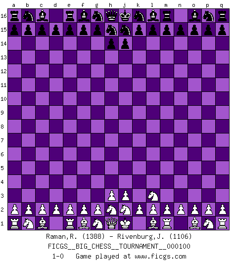 Last move : 1-0 2015 September 3 22:20:8 [Event "FICGS__BIG_CHESS__TOURNAMENT__000100"] [Site "FICGS"] [Date "2015.08.03"] [Round "1"] [White "Raman,Ranganathan"] [Black "Rivenburg,John"] [Result "1-0"] [WhiteElo "1388"] [BlackElo "1106"] 1.k1-l3 1-0 This big chess game has been lost on time (started : 2015.08.03 21:6:56) Follow this game move after move (download)Chess is ruthless: you've got to be prepared to kill people. (Nigel Short) Der beste Spieler in einem Turnier gewinnt es nie. Er landet auf Platz zwei oder drei. (Siegbert Tarrasch) Buenas posiciones no logran ganar juegos, buenas movidas sí. (Gerald Abrahams) Même si vous avez un bon coup à faire, regardez toujours s'il n'y en a pas un qui lui soit préférable. (Pedro Damiano) My poor ole parrot... Is not in the circulation of displays ....poo hoo hoo :) (Wayne Lowrance's enigma)