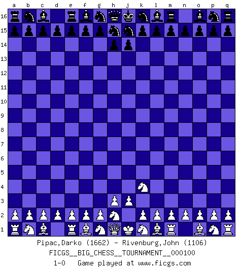 Last move : 1-0 2015 September 2 22:18:19 [Event "FICGS__BIG_CHESS__TOURNAMENT__000100"] [Site "FICGS"] [Date "2015.08.03"] [Round "1"] [White "Pipac,Darko"] [Black "Rivenburg,John"] [Result "1-0"] [WhiteElo "1662"] [BlackElo "1106"] 1.j2-k4 1-0 This big chess game has been lost on time (started : 2015.08.03 21:6:56) Follow this game move after move (download)Capture of the adverse King is the ultimate but not the first object of the game. (William Steinitz) Taktik ist was man tun muß, wenn etwas zu tun ist. Strategie ist was man tun muß, wenn nichts zu tun ist. (Savielly Grigorievitsch Tartakower) Desconfianza es la característica mas necesaria de un jugador de Ajedrez. (Siegbert Tarrasch) Nous vivons dans un monde échiquéen : chaque jour qui passe est un défi à relever. (Philosophe Sasha) Art disturbs, science reassures. (Georges Braque, Le Jour et la Nuit)