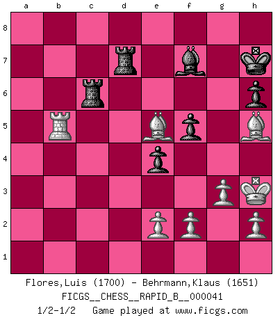 Last move : 1/2-1/2 2007 July 16 11:23:35 [Event "FICGS__CHESS__RAPID_B__000041"] [Site "FICGS"] [Date "2007.03.09"] [Round "1"] [White "Flores,Luis"] [Black "Behrmann,Klaus"] [Result "1/2-1/2"] [WhiteElo "1700"] [BlackElo "1651"] 1.d4 f5 2.g3 Nf6 3.Bg2 e6 4.Nf3 Be7 5.O-O O-O 6.c4 d5 7.b3 c5 8.Bb2 dxc4 9.bxc4 cxd4 10.Nxd4 e5 11.Nb5 Nc6 12.N1c3 a6 13.Qxd8 Rxd8 14.Nc7 Rb8 15.Rad1 Bd6 16.N7d5 Be6 17.Nxf6+ gxf6 18.Nd5 Kf7 19.Bc3 b5 20.cxb5 axb5 21.Nxf6 Kxf6 22.Bxc6 b4 23.Ba1 Bxa2 24.Rd2 Bb3 25.Kg2 Rb6 26.Bf3 Rc8 27.Rb1 Bc2 28.Rxd6+ Rxd6 29.Rxb4 Rc5 30.Bb2 Kg6 31.Rh4 Rb5 32.Bc3 h6 33.Bh5+ Kh7 34.Be8 Rb7 35.Rc4 Rd8 36.Bh5 Bb3 37.Rc5 Bd5+ 38.Kh3 e4 39.Bf6 Rf8 40.Be5 Rd7 41.Bf4 Rf6 42.Be5 Rc6 43.Rb5 Bf7 1/2-1/2 Dutch defense Kingside Castling by player White (move 5) Kingside Castling by player Black (move 5) This chess game ended in a draw. Follow this game move after move (download)Fischer is under obligation to nobody. (Joseph Platz) Schachspieler können ausgezeichnet Varianten am Schachbrett berechnen, aber nicht im realen Leben. Zu stark ist der Individualismus im Schach ausgeprägt, und für viele ist ein kleiner momentaner persönlicher Vorteil wichtiger als ein weit größerer Vorteil von morgen. (Anatoly Karpov) Los Peones son nacidos libres, y aún así, se encuentran encadenados por todos lados. (Rick Kennedy) Shah mat. Le roi est mort. Cri de fierté d'un joueur venant de terrasser son adversaire, courtoisement, sans effusion de sang. Train yourself to let go of everything you fear to lose. (Master Yoda in Star Wars ep.3)