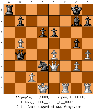 Last move : 0-1 2015 November 30 14:28:40 [Event "FICGS__CHESS__CLASS_B__000228"] [Site "FICGS"] [Date "2015.08.04"] [Round "1"] [White "Duttagupta,Aniruddha"] [Black "Osipov,Sergey"] [Result "0-1"] [WhiteElo "2003"] [BlackElo "1888"] 1.e4 c5 2.Nf3 d6 3.d4 cxd4 4.Nxd4 Nf6 5.Nc3 a6 6.Be3 e5 7.Nb3 Be6 8.f4 exf4 9.Bxf4 Nc6 10.Qe2 Rc8 11.h3 Nb4 12.a3 Nh5 13.axb4 Nxf4 14.Qf3 g5 15.b5 a5 16.g3 Ng6 17.Nd4 Bg7 18.O-O-O O-O 19.h4 a4 20.Nxa4 Qa5 21.b3 Ne5 22.Qe3 Qb4 23.Be2 Ra8 24.Nxe6 fxe6 25.Rdf1 Rfc8 26.Kd1 Rxa4 27.bxa4 Qxa4 28.Qc1 Ra8 29.Qe3 Qb4 30.Bd3 Nxd3 0-1 Sicilian : Najdorf, Byrne (English) attack Queenside Castling by player White (move 18) Kingside Castling by player Black (move 18) Player Black won this chess game. Follow this game move after move (download)Look at Garry Kasparov. After he loses, invariably he wins the next game. He just kills the next guy. That's something that we have to learn to be able to do. (Maurice Ashley) Im Fernschach kannst du während dem Spiel rauchen. (John Christen Knudsen) El arma más poderosa en el Ajedrez, es tener la próxima movida. (David Bronstein) Si le désir cupide (et stupide) de gagner est une inépuisable source de souffrance, une combinaison brillante sur l'échiquier est une découverte : le coquelicot qui s'épanouit lorsque apparaît la Voie Lactée. (Arrabal) Luck is the residue of design. (John Milton)