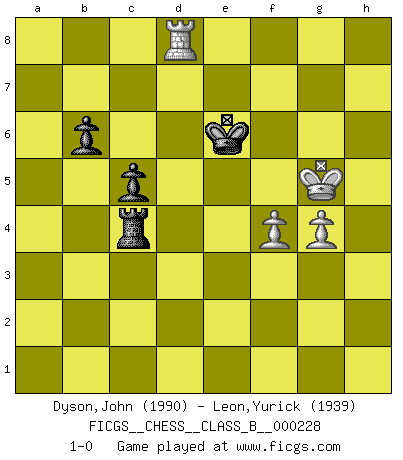 Last move : 1-0 2015 November 22 19:42:40 [Event "FICGS__CHESS__CLASS_B__000228"] [Site "FICGS"] [Date "2015.08.04"] [Round "1"] [White "Dyson,John"] [Black "Leon,Yurick"] [Result "1-0"] [WhiteElo "1990"] [BlackElo "1939"] 1.d4 d5 2.c4 e6 3.g3 Nf6 4.Nf3 Nbd7 5.Bg2 Be7 6.O-O O-O 7.Qc2 a5 8.Rd1 c6 9.Nbd2 b6 10.e4 Bb7 11.b3 a4 12.Bb2 dxe4 13.Nxe4 Nxe4 14.Qxe4 Qc7 15.Qc2 c5 16.d5 Bf6 17.dxe6 fxe6 18.Bxf6 Nxf6 19.Qe2 Rfe8 20.Ne5 axb3 21.axb3 Rxa1 22.Rxa1 Bxg2 23.Kxg2 Nd7 24.Nxd7 Qxd7 25.Rd1 Qc6+ 26.Qf3 Qc7 27.Qe4 g6 28.Qd3 Kf7 29.h4 Qc6+ 30.Qf3+ Qxf3+ 31.Kxf3 e5 32.Ke4 Ke6 33.Rd5 Ra8 34.Rxe5+ Kd6 35.Rd5+ Ke6 36.h5 Ra2 37.hxg6 hxg6 38.f4 Rb2 39.Rd3 Ra2 40.g4 Re2+ 41.Kf3 Rh2 42.Kg3 Rh1 43.Rd8 Rb1 44.Kh4 Rxb3 45.Kg5 Rb4 46.Kxg6 Rxc4 47.Kg5 1-0 Queen's gambit declined Kingside Castling by player White (move 6) Kingside Castling by player Black (move 6) 10 pieces endgame at move 44 : White KRPPP , Black KRPPP WHITE : King + 1 Rook 3 Pawns BLACK : King + 1 Rook 3 Pawns 9 pieces endgame at move 46 : White KRPPP , Black KRPP WHITE : King + 1 Rook 3 Pawns BLACK : King + 1 Rook 2 Pawns 8 pieces endgame at move 46 : White KRPP , Black KRPP WHITE : King + 1 Rook 2 Pawns BLACK : King + 1 Rook 2 Pawns Player White won this chess game. Follow this game move after move (download)Avoid the crowd. Do your own thinking independently. Be the Chess player, not the Chess piece. (Ralph Charell) Kein Großmeister ist normal. Sie unterscheiden sich nur im Ausmaß Ihrer Verrücktheit. (Viktor Kortschnoi) Tu sabes que vas a perder. Aún cuando tenía la ventaja, yo sabía que iba a perder. - al estar jugando con Fischer (Andrew Soltis) Demandez au pauvre Cg1 ce qu'il en pense. Eduard Gufeld à propos de la variante Saemisch de l'Est-Indienne. Horse racing is animated roulette. (Roger Kahn)