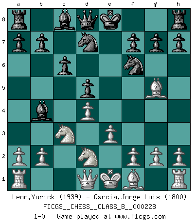 Last move : 1-0 2015 September 30 11:48:47 [Event "FICGS__CHESS__CLASS_B__000228"] [Site "FICGS"] [Date "2015.08.04"] [Round "1"] [White "Leon,Yurick"] [Black "Garcia,Jorge Luis"] [Result "1-0"] [WhiteElo "1939"] [BlackElo "1800"] 1.d4 Nf6 2.Nf3 e6 3.c4 d5 4.Nc3 Bb4 5.Bg5 Nbd7 6.cxd5 exd5 7.Nd2 c6 8.e3 1-0 This chess game has been lost on time (started : 2015.08.04 9:35:28) Queen's pawn game Player White won this chess game. Follow this game move after move (download)Some sacrifices are sound; the rest are mine. (Mikhail Tal) Strategie ist, wie man ein Mädchen auf den Rücksitz bekommt. Taktik ist, was man tut, wenn man dann dort ist. (Anonymous) La señal de un Gran Maestro es su habilidad de ganar una partida rápidamente y sin dolor. (Irving Chernev) Il a essayé de se convaincre qu'il pourrait empêcher toutes les erreurs et ne jamais perdre. L'horreur ! Gary Kasparov au sujet de Robert Fischer. Good decisions come from experience, and experience comes from bad decisions. (Anonymous)