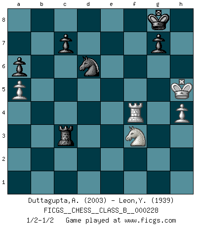 Last move : 1/2-1/2 2015 November 27 21:14:40 [Event "FICGS__CHESS__CLASS_B__000228"] [Site "FICGS"] [Date "2015.08.04"] [Round "1"] [White "Duttagupta,Aniruddha"] [Black "Leon,Yurick"] [Result "1/2-1/2"] [WhiteElo "2003"] [BlackElo "1939"] 1.e4 e5 2.Nf3 Nc6 3.Bb5 a6 4.Ba4 Nf6 5.O-O b5 6.Bb3 Be7 7.Re1 O-O 8.a4 b4 9.d4 d6 10.dxe5 dxe5 11.Nbd2 Bb7 12.c3 Bc5 13.Qc2 Qe7 14.Bd5 bxc3 15.bxc3 Ng4 16.Re2 Na5 17.Bxb7 Nxb7 18.h3 Nf6 19.Nc4 Nd7 20.Rb1 Rab8 21.Ne3 Qe6 22.Re1 f6 23.Nd5 Rfc8 24.Rd1 Nb6 25.Ne1 Nd6 26.a5 Nxd5 27.Rxb8 Rxb8 28.Rxd5 Nb7 29.Qb1 Qe8 30.Qa2 Qe6 31.Qb1 Qe8 32.Qb3 Nd6 33.Qa2 Qf7 34.Qe2 Ba7 35.Be3 Bxe3 36.Qxe3 f5 37.f3 fxe4 38.fxe4 Rb1 39.Kh2 Qf1 40.Nd3 h5 41.Kg3 h4+ 42.Kxh4 Qxg2 43.Rxe5 Nf7 44.Rf5 Rg1 45.Ne5 Re1 46.Qf3 Rxe4+ 47.Kh5 Qxf3+ 48.Nxf3 Re3 49.h4 Nd6 50.Rf4 Rxc3 1/2-1/2 Ruy Lopez : 5.O-O Kingside Castling by player White (move 5) Kingside Castling by player Black (move 7) This chess game ended in a draw. Follow this game move after move (download)A bad day of Chess is better than any good day at work. (Anonymous) Jeder Fehler erscheint unglaublich dumm, wenn andre ihn begehen. (Georg Christoph Lichtenberg) Los errores estan ahí, esperando a que se cometan. (Savielly Tartakower) La guerre est enfant de la passion, la passion est enfant du narcissisme et le narcissisme est l'enfant. (...) Une autre partie ? (Thibault de Vassal) Once you start thinking you have nothing left to learn, you have everything to learn. (Steve Badget)