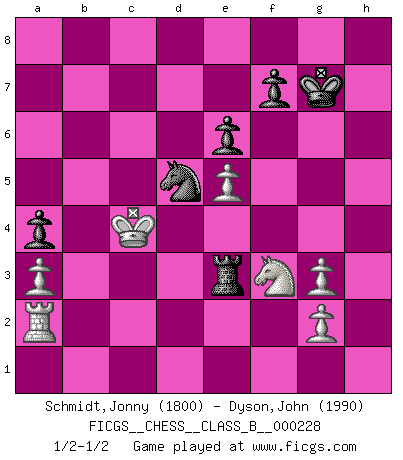 Last move : 1/2-1/2 2016 February 12 10:57:34 [Event "FICGS__CHESS__CLASS_B__000228"] [Site "FICGS"] [Date "2015.08.04"] [Round "1"] [White "Schmidt,Jonny"] [Black "Dyson,John"] [Result "1/2-1/2"] [WhiteElo "1800"] [BlackElo "1990"] 1.e4 c6 2.d4 d5 3.e5 Bf5 4.Nf3 e6 5.Be2 c5 6.O-O Nc6 7.c3 cxd4 8.cxd4 Nge7 9.a3 Nc8 10.Bg5 Be7 11.Bxe7 N8xe7 12.b4 O-O 13.Nbd2 Qb6 14.Nb3 Rfc8 15.Nc5 a5 16.Qd2 Be4 17.b5 Nxd4 18.Nxe4 Nxe2+ 19.Qxe2 dxe4 20.Qxe4 a4 21.h3 h6 22.Rfc1 Qxb5 23.Rxc8+ Rxc8 24.Rb1 Qc4 25.Qxc4 Rxc4 26.Rxb7 Nd5 27.Rb8+ Kh7 28.Rb7 Rf4 29.Kf1 g5 30.Ke2 Kg6 31.Kd3 h5 32.Rb8 g4 33.hxg4 hxg4 34.Nh4+ Kg7 35.Rb2 g3 36.fxg3 Rf1 37.Ra2 Rg1 38.Kc4 Rc1+ 39.Kd4 Rc3 40.Nf3 Re3 41.Kc4 1/2-1/2 Caro-Kann : Advance variation Kingside Castling by player White (move 6) Kingside Castling by player Black (move 12) This chess game ended in a draw. Follow this game move after move (download)If Chess is a science, it's a most inexact one. If Chess is an art, it is too exacting to be seen as one. If Chess is a sport, it's too esoteric. If Chess is a game, it's too demanding to be just a game. If Chess is a mistress, she's a demanding one. If Chess is a passion, it's a rewarding one. If Chess is life, it's a sad one. (Unknown) Du musst Deinen Gegner in einen tiefen dunklen Wald führen wo 2+2=5 ist und wo der Weg, der wieder hinausführt, nur breit genug für einen ist. (Mikhail Nekhemyevich Tal) Con el fin de mejorar tu juego, debes de estudiar los finales antes que todo, ya que mientras que los finales pueden ser estudiados y dominados por sí mismos, el juegomedio y la apertura deben de ser estudiados en relación con los finales. (José Raúl Capablanca) Avant la finale, les dieux ont créé le milieu de partie. (Tarrasch) In my experience, there's no such thing as luck. (Obi-Wan Kenobi in Star Wars ep.4)