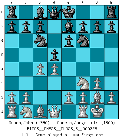 Last move : 1-0 2015 September 29 23:47:13 [Event "FICGS__CHESS__CLASS_B__000228"] [Site "FICGS"] [Date "2015.08.04"] [Round "1"] [White "Dyson,John"] [Black "Garcia,Jorge Luis"] [Result "1-0"] [WhiteElo "1990"] [BlackElo "1800"] 1.d4 d5 2.c4 e6 3.g3 Nc6 4.Nf3 Nf6 5.Bg2 Be7 6.O-O 1-0 This chess game has been lost on time (started : 2015.08.04 9:35:28) Queen's gambit declined Kingside Castling by player White (move 6) Player White won this chess game. Follow this game move after move (download)It is the aim of the modern school, not to treat every position according to one general law, but according to the principle inherent in the position. (Richard Reti) Alles was ich jemals tun will ist Schach spielen. (Robert James Fischer) A través de las casillas del tablero, los Indios explican el movimiento del tiempo y la edad, las influencias mas altas que controlan el mundo y los lazos que vinculan al Ajedrez con el alma humana. (Al-Masudi) L'ordinateur a tué l'originalité. Il n'y a plus guère d'aventures sur l'échiquier. (Jacob Murray) The weakness of an artist is dogma. (Josh Waitzkin)