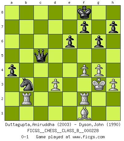 Last move : 0-1 2016 March 12 6:22:30 [Event "FICGS__CHESS__CLASS_B__000228"] [Site "FICGS"] [Date "2015.08.04"] [Round "1"] [White "Duttagupta,Aniruddha"] [Black "Dyson,John"] [Result "0-1"] [WhiteElo "2003"] [BlackElo "1990"] 1.e4 c6 2.Nc3 d5 3.Nf3 Bg4 4.h3 Bxf3 5.Qxf3 Nf6 6.d3 e6 7.Bd2 Qb6 8.Rb1 Bd6 9.exd5 cxd5 10.Be3 d4 11.Bxd4 Qxd4 12.Qxb7 Bb4 13.Qxa8 Qb6 14.Rc1 Nd5 15.a3 Bxc3+ 16.bxc3 O-O 17.c4 Nc6 18.Qxf8+ Kxf8 19.cxd5 Qa5+ 20.Kd1 Qxd5 21.c3 Qb3+ 22.Rc2 Qb1+ 23.Rc1 Qa2 24.g4 Na5 25.Rc2 Qb1+ 26.Rc1 Qb3+ 27.Rc2 g6 28.f3 Qxa3 29.R1h2 Nb3 30.Rhf2 Qa1+ 31.Ke2 Qb1 32.Ke3 Na1 33.Ra2 Qc1+ 34.Ke4 Qxc3 35.f4 Qc6+ 36.Ke3 Nb3 37.Rab2 Qc5+ 38.Kf3 a5 39.Kg3 a4 0-1 This chess game has been lost on time (started : 2015.08.04 9:35:28) Caro-Kann : Two knights, 3...Bg4 Kingside Castling by player Black (move 16) Player Black won this chess game. Follow this game move after move (download)I'm not a materialistic person, in that, I don't suffer the lack or loss of money. The absence of worldly goods I don't look back on. For Chess is a way I can be as materialistic as I want without having to sell my soul. (Jamie Walter Adams) Alle offensichtlichen Züge sehen nach dem Spiel in der Analyse verdächtig aus. (Viktor Kortschnoi) En posiciones complicadas, Bobby Fischer pocas veces tuvo que temer de cualquiera. (Paul Keres) Le temps de noter son nom sur la feuille de partie, j'étais déjà en zeitnot ! D'un modeste amateur apparié lors de la première ronde d'un open contre le grand-maître Azmaïparashvili. The question of whether computers can think is just like question of whether submarines can swim. (Edsger W. Dijkstra)
