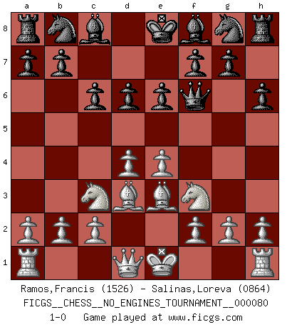 Last move : 1-0 2015 September 18 11:11:0 [Event "FICGS__CHESS__NO_ENGINES_TOURNAMENT__000080"] [Site "FICGS"] [Date "2015.08.05"] [Round "1"] [White "Ramos,Francis"] [Black "Salinas,Loreva"] [Result "1-0"] [WhiteElo "1526"] [BlackElo "0864"] 1.e4 e6 2.d4 d6 3.Nc3 c6 4.Be3 Qf6 5.Nf3 h6 6.Bd3 1-0 This chess game has been lost on time (started : 2015.08.05 17:22:37) Lengfellner system Player White won this chess game. Follow this game move after move (download)Bobby Fischer is the greatest Chess genius of all time ! (Alexander Kotov) Karpov ist ein Museumsstück. (Garry Kasparov) Tu cuerpo tiene que estar en óptima condición. Tu Ajedrez se deteriora como lo hace tu cuerpo. No puedes separar la mente y el cuerpo. (Bobby Fischer) Ce n'est pas pour s'amuser qu'il joue aux échecs : il célèbre un culte. (Vladimir Nabokov) Games, world of games... There's always an opponent, and there's always a victim. (Revolver, movie)