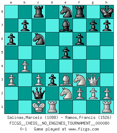 Last move : 0-1 2015 October 26 15:40:34 [Event "FICGS__CHESS__NO_ENGINES_TOURNAMENT__000080"] [Site "FICGS"] [Date "2015.08.05"] [Round "1"] [White "Salinas,Marcelo"] [Black "Ramos,Francis"] [Result "0-1"] [WhiteElo "1088"] [BlackElo "1526"] 1.e3 c5 2.Nc3 d6 3.Bc4 e6 4.Qf3 Nc6 5.Bb5 Bd7 6.a3 Nf6 7.d4 cxd4 8.exd4 Nxd4 9.Bxd7+ Qxd7 10.Qd3 Nc6 11.Nb5 Be7 12.Qg3 O-O 13.Bh6 Ne8 14.Nf3 Kh8 15.Bg5 a6 16.Nbd4 Rc8 17.O-O-O f6 18.Be3 e5 19.Ne2 Qe6 20.b3 d5 21.b4 d4 22.Bd2 Qa2 23.c3 d3 24.Be3 Qc2+ 0-1 Van't Kruijs Opening Kingside Castling by player Black (move 12) Queenside Castling by player White (move 17) Player Black won this chess game. Follow this game move after move (download)It is always better to sacrifice your opponent's men. (Savielly Tartakower) Er war ein guter Schachspieler, aber ich kann Leute nicht ausstehen, die 'Heil Hitler' rufen (Über Alexander Aljechin). (Miguel Najdorf) El Ajedrez es el juego mas altamente simbólico, pero las agresiones estan por lo tanto aún mas francamente representadas en la partida. Tal vez comenzo como un juego de guerra; Algo como la representación de una batalla en miniatura entre las fuerzas de dos reinos. (Karl Meninger) Votre prénom est 'Tactique', votre deuxième prénom est 'Tactique' et votre nom est 'Tactique'. (Ken Smith) To send light into the darkness of men's hearts - such is the duty of the artist. (Schumann)