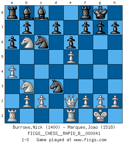 Last move : 1-0 2007 April 12 19:39:52 [Event "FICGS__CHESS__RAPID_B__000041"] [Site "FICGS"] [Date "2007.03.09"] [Round "1"] [White "Burrows,Nick"] [Black "Marques,Joao"] [Result "1-0"] [WhiteElo "1400"] [BlackElo "1518"] 1.e4 c5 2.Nf3 e6 3.d4 cxd4 4.Nxd4 a6 5.Bd3 Qc7 6.O-O Nf6 7.Qe2 Bc5 8.Nb3 Ba7 9.e5 Nd5 10.Na3 Nc6 11.Nc4 O-O 12.a4 Bb8 13.Re1 Ndb4 14.Be3 Nxd3 15.Bb6 Qxb6 16.Nxb6 1-0 Sicilian : Kan, 5.Bd3 Kingside Castling by player White (move 6) Kingside Castling by player Black (move 11) Player White won this chess game. Follow this game move after move (download)Many Chess players were surprised when after the game, Fischer quietly explained: 'I had already analyzed this possibility' in a position which I thought was not possible to foresee from the opening. (Mikhail Tal) Ein Isolani verdüstert die Stimmung auf dem ganzen Schachbrett. (Savielly Grigorievitsch Tartakower) Una clavada es mas poderosa que una espada. (Fred Reinfeld) Tout change constamment, y compris dans le monde des Echecs. (Botvinnik) Secret operations are essential in war; upon them the army relies to make its every move. (Sun Tzu)