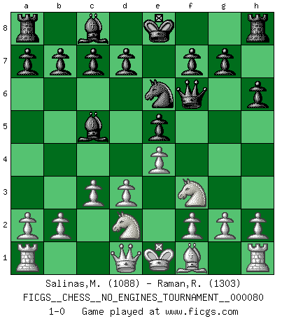 Last move : 1-0 2015 October 17 14:1:1 [Event "FICGS__CHESS__NO_ENGINES_TOURNAMENT__000080"] [Site "FICGS"] [Date "2015.08.05"] [Round "1"] [White "Salinas,Marcelo"] [Black "Raman,Ranganathan"] [Result "1-0"] [WhiteElo "1088"] [BlackElo "1303"] 1.e4 Nc6 2.d3 e5 3.Qf3 Nf6 4.Bg5 Nd4 5.Qd1 h6 6.Bxf6 Qxf6 7.Nf3 Bc5 8.c3 Ne6 9.Nbd2 1-0 This chess game has been lost on time (started : 2015.08.05 17:22:37) KP : Nimzovich defense Player White won this chess game. Follow this game move after move (download)In the perfect Chess combination as in a first-rate short story, the whole plot and counter-plot should lead up to a striking finale, the interest not being allayed until the very last moment. (Yates and Winter) Es ist nicht das erste mal, dass sich die FIDE dem Arabischen Geld gebeugt hat (über die FIDE WM 2004 in Lybien). (Larry Evans) Por esta medida (el intervalo entre Fischer y sus contemporaneos), yo le considero el mas grande campeón mundial. (Garry Kasparov) RxDa4 pat (...) Wisdom doesn't necessarily come with age. Sometimes age just shows up all by itself. (Tom Wilson)