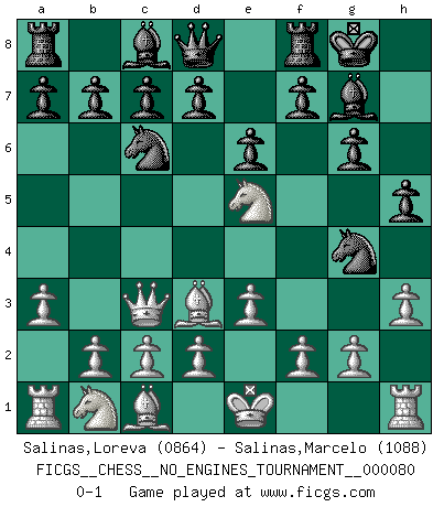 Last move : 0-1 2015 October 13 1:16:21 [Event "FICGS__CHESS__NO_ENGINES_TOURNAMENT__000080"] [Site "FICGS"] [Date "2015.08.05"] [Round "1"] [White "Salinas,Loreva"] [Black "Salinas,Marcelo"] [Result "0-1"] [WhiteElo "0864"] [BlackElo "1088"] 1.e3 e6 2.Qg4 g6 3.Nf3 h5 4.Qc4 Nc6 5.Qc3 Nf6 6.a3 Bh6 7.Ne5 O-O 8.Bd3 Ng4 9.h3 Bg7 0-1 This chess game has been lost on time (started : 2015.08.05 17:22:37) Van't Kruijs Opening Kingside Castling by player Black (move 7) Player Black won this chess game. Follow this game move after move (download)Modern Chess is too much concerned with things like Pawn structure. Forget it, Checkmate ends the game. (Nigel Short) Ich suche im Schach immer etwas Eigenes. Riskantes Spiel im Stile schachlicher Musketiere ist nicht meine Sache, auch wenn es vielen Freunden scharfer Wendungen gefällt. (Anatoly Karpov) Una mala movida nulifica cuarenta buenas. (Horowitz) Donnez-moi un Cavalier en 6e et je gagnerais toutes mes parties. (Steinitz) Men never do evil so completely and cheerfully as when they do it from religious conviction. (Blaise Pascal)