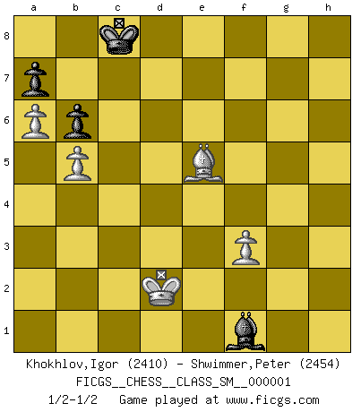 Last move : 1/2-1/2 2006 December 6 13:59:56 [Event "FICGS__CHESS__CLASS_SM__000001"] [Site "FICGS"] [Date "2006.05.30"] [Round "1"] [White "Khokhlov,Igor"] [Black "Shwimmer,Peter"] [Result "1/2-1/2"] [WhiteElo "2410"] [BlackElo "2454"] 1.d4 Nf6 2.c4 e6 3.Nf3 b6 4.g3 Ba6 5.Qa4 Bb7 6.Bg2 c5 7.dxc5 Bxc5 8.O-O O-O 9.Nc3 d5 10.Rd1 Qe8 11.cxd5 Nxd5 12.Qc2 Nxc3 13.Qxc3 Na6 14.b3 Rc8 15.Qb2 Qe7 16.a3 Rfd8 17.Rd2 Bd6 18.b4 Nc7 19.Rc2 Qd7 20.Be3 Be4 21.Rc4 Bd5 22.Rc2 Nb5 23.Rac1 Rxc2 24.Rxc2 f6 25.a4 Nc7 26.b5 e5 27.Rd2 Qf7 28.Qc3 Be6 29.Ne1 Nd5 30.Bxd5 Bxd5 31.a5 Qc7 32.Qc2 Qxc2 33.Nxc2 Bc7 34.Nb4 Bb7 35.a6 Rxd2 36.Bxd2 Ba8 37.f3 f5 38.Kf2 f4 39.gxf4 exf4 40.Bc3 Kf7 41.Ke1 g5 42.Kd2 h5 43.h3 Ke6 44.Kd3 Bd6 45.Kc4 Bxb4 46.Bxb4 Bd5+ 47.Kc3 h4 48.Kd3 Kd7 49.Bf8 g4 50.fxg4 Bg2 51.Bh6 Bxh3 52.Bg5 Bxg4 53.Bxh4 Kd6 54.Bf2 Bd7 55.Kc4 Bh3 56.Kc3 Bf1 57.Kd2 Kc7 58.Bd4 Kc8 59.Be5 f3 60.exf3 1/2-1/2 Queen's Indian : Nimzovich variation (exaggerated Fianchetto) Kingside Castling by player White (move 8) Kingside Castling by player Black (move 8) 10 pieces endgame at move 53 : White KBPPP , Black KBPPP WHITE : King + 1 Bishop 3 Pawns BLACK : King + 1 Bishop 3 Pawns 9 pieces endgame at move 60 : White KBPPP , Black KBPP WHITE : King + 1 Bishop 3 Pawns BLACK : King + 1 Bishop 2 Pawns This chess game ended in a draw. Follow this game move after move (download)On the chessboard, lies and hypocrisy do not survive long. (Emanuel Lasker) Wer mein Gambit spielt, muß bereit sein, alle Brücken hinter sich abzubrechen. Es verändert den ganzen Menschen. Es wirkt wie ein Zauberstab und fördert verkümmerte, gute Charakter- eigenschaften wieder zu Tage. (Emil Joseph Diemer) La batalla por la última verdad nunca sera ganada. Y es por eso que el Ajedrez es tan fascinante. (Hans Kmoch) Je crois qu'il existe des manières très spécifiques de jouer efficacement contre une machine. Evidemment, nous n'avons aucune chance en technique pure, parce que l'ordinateur calcule de manière parfaite. Mais lorsque nous faisons appel à notre cerveau, en utilisant l'intuition et la compréhension, alors nous restons beaucoup plus forts. (Anatoli Karpov) 'preceded by its own quotation yields a falsehood' preceded by its own quotation yields a falsehood. (W. V. O. Quine - Set Theory And Its Logic, 1953)