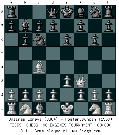 Last move : 0-1 2015 September 18 11:11:0 [Event "FICGS__CHESS__NO_ENGINES_TOURNAMENT__000080"] [Site "FICGS"] [Date "2015.08.05"] [Round "1"] [White "Salinas,Loreva"] [Black "Foster,Duncan"] [Result "0-1"] [WhiteElo "0864"] [BlackElo "1559"] 1.e3 b6 2.Qf3 Nc6 3.Bc4 e6 4.Qh5 g6 5.Qf3 Bb7 0-1 This chess game has been lost on time (started : 2015.08.05 17:22:37) Van't Kruijs Opening Player Black won this chess game. Follow this game move after move (download)Different people feel differently about resigning. (Bobby Fischer) Weshalb minderdergeübte Spieler mit g2-g4 beginnen? Die betreffenden sind unschlüssig, ob sie nun rechts (h4) oder links (f4) beginnen sollen, und in ihrer Ratlosigkeit entschliessen sie sich nach guter Bürgerart dazu, den goldenen Mittelweg zu wählen. (Aaron Nimzowitsch) Peones: ellos son el alma de esta partida, solos forman el ataque y la defensa. (Philidor) Psychologiquement, tu dois avoir confiance en toi même, mais cette confiance doit être basée sur des faits. (Robert Fischer) There is no instance of a country having benefited from prolonged warfare. (Sun Tzu)